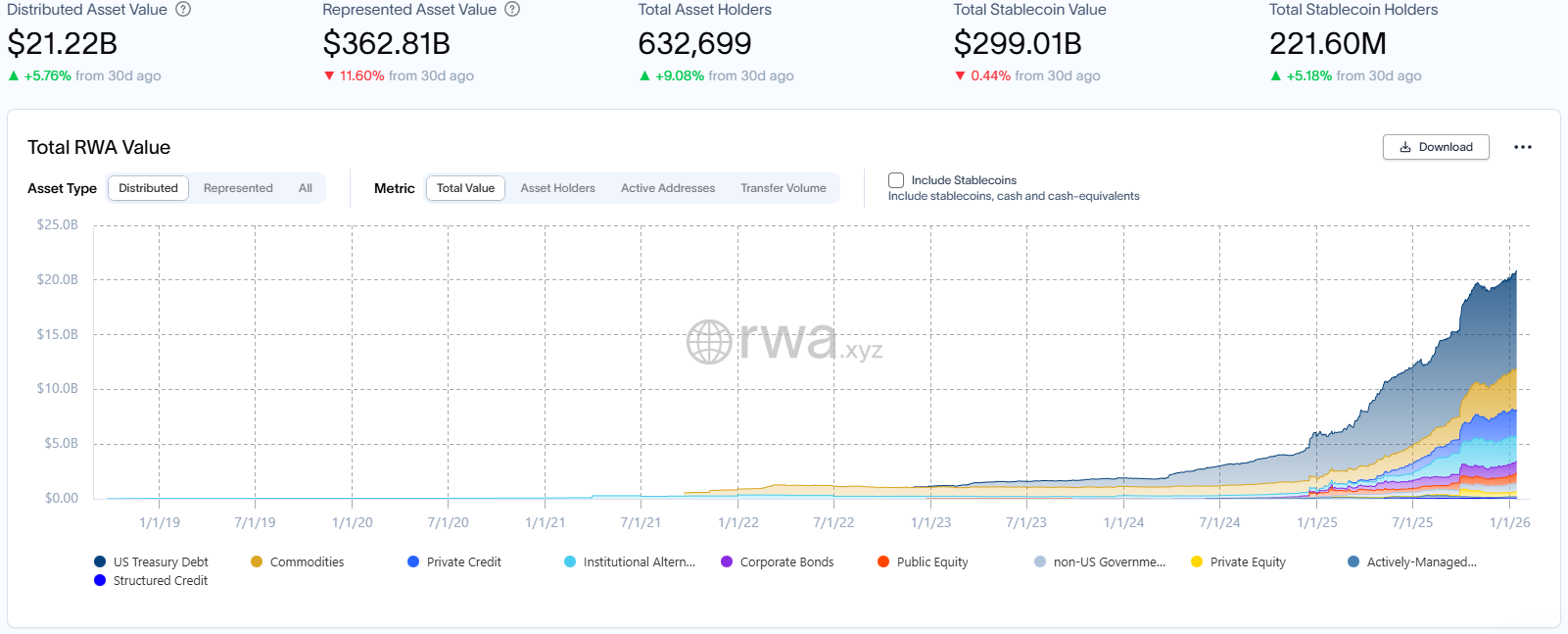 По данным RWA.xyz, на 16 января 2026 года, общий объем рынка блокчейна RWA достиг 21,22 млрд долларов США, что на 5,76% больше, чем в предыдущем месяце, сохраняя устойчивый темп роста; общее количество держателей активов увеличилось до около 632 700, что на 9,08% больше, чем в предыдущем месяце.