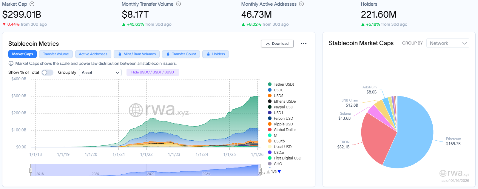 Общая капитализация стейблкоинов достигла 299,01 млрд долларов США, что на 0,44% меньше, чем в предыдущем месяце, и общий объем продолжает сокращаться. Объем транзакций за месяц взлетел до 817 млрд долларов США, что на 45,63% больше, чем в предыдущем месяце. Оборачиваемость (объем транзакций / капитализация) достигла 27,3, что указывает на резкое повышение активности и эффективности использования существующих средств.