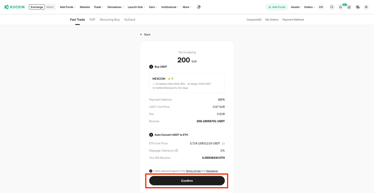 Because the timing of the merchant’s USDT release is uncertain, the cryptocurrency price may fluctuate significantly. If the price at the time of release is much higher than when the user confirmed the order, which would result in receiving fewer tokens, the system will ask the user to manually confirm whether to proceed with the conversion. If the user declines, they will only receive the USDT paid by the merchant. The user can still convert it to the desired cryptocurrency later through the Convert feature on KuCoin at any time.