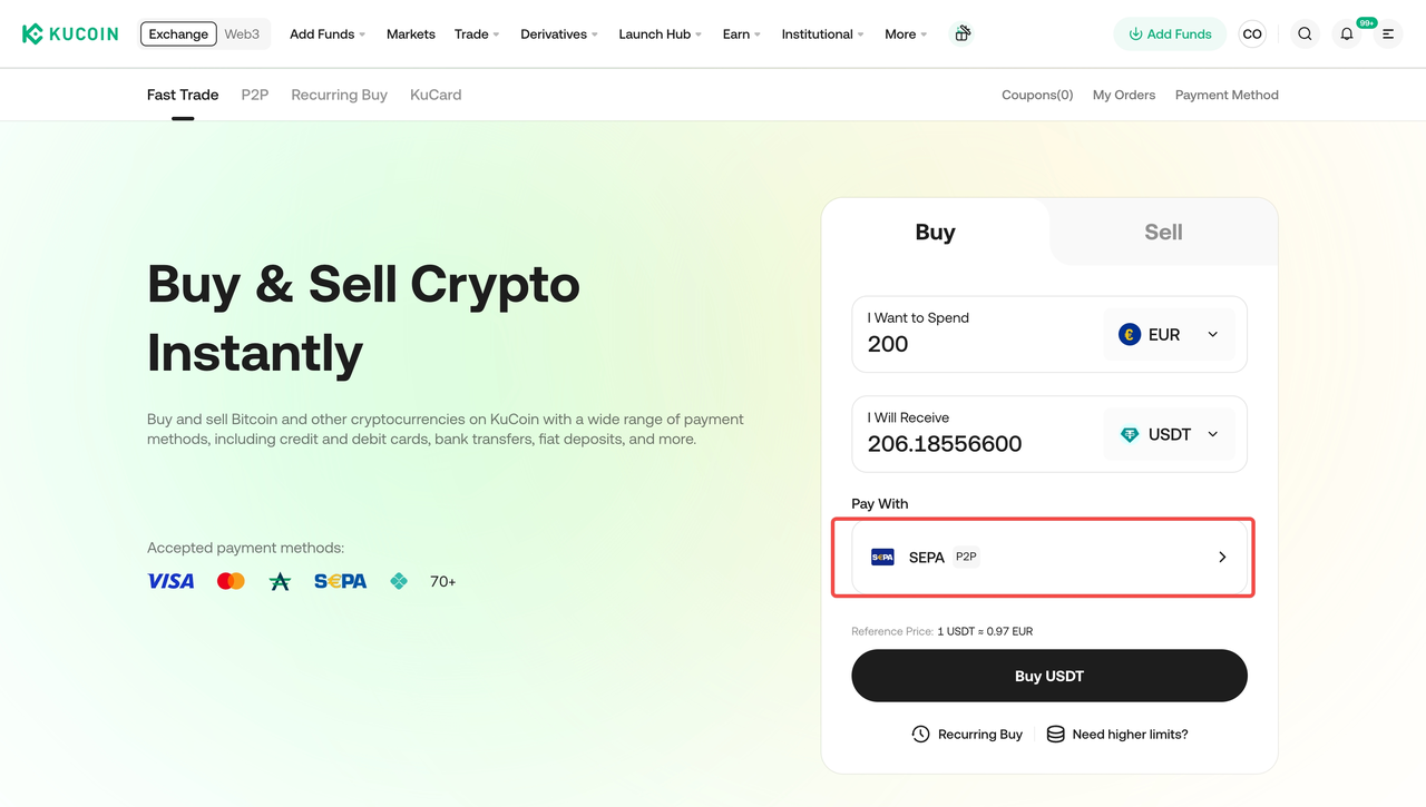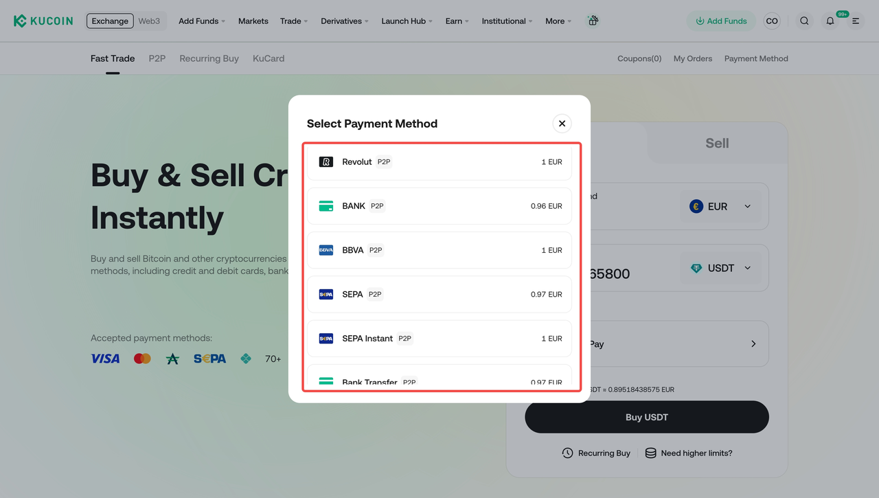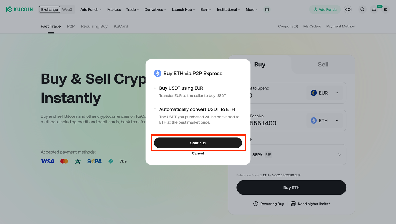 2. Go to Fast Trade, first select the cryptocurrency you want to buy and the fiat currency you will pay with, then choose P2P Express as your payment method (the option marked with the “P2P” tag).