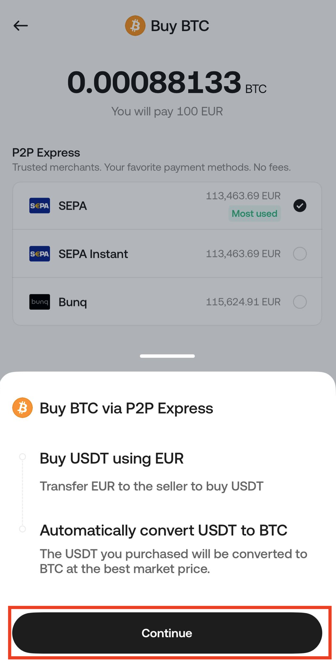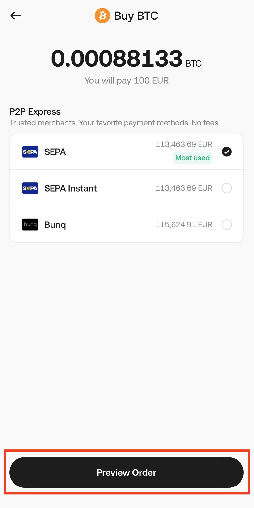 There are two ways to buy crypto via P2P Express in your App.You can either follow the same instructions as described above for the Web version, or follow the steps below to complete your purchase: