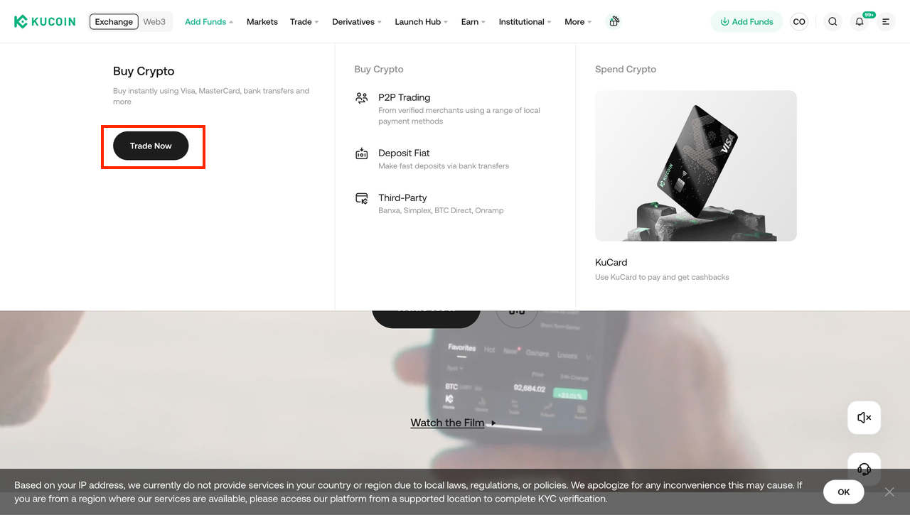 1. Go to the official KuCoin website and log in to your KYC-verified account. At the top menu bar, select “Add Funds”, then choose “Buy Crypto - Trade Now”