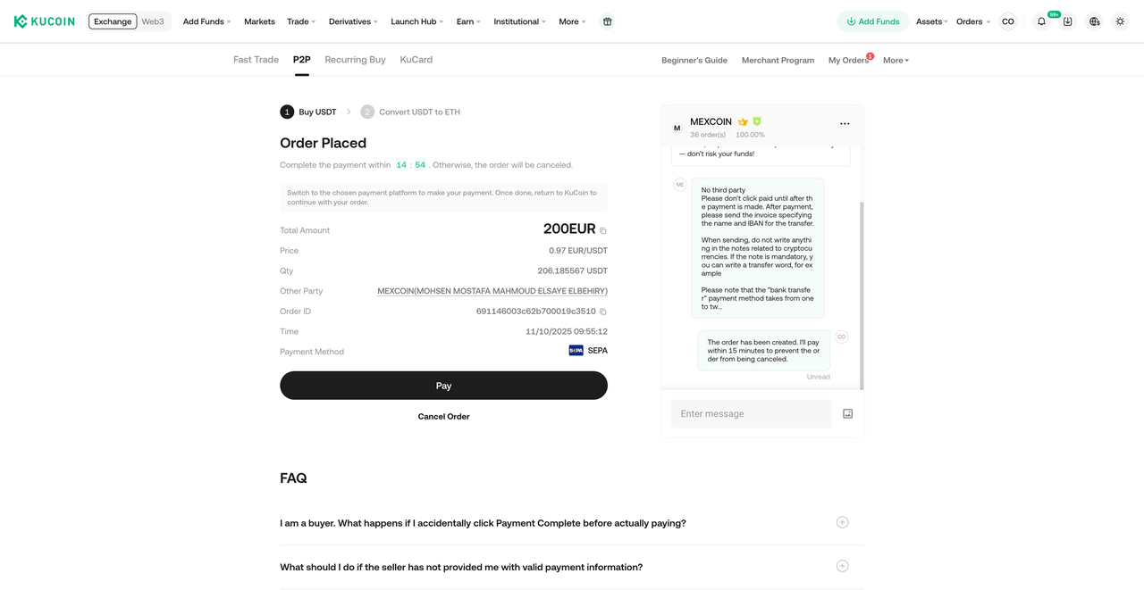 6. Your order will then be created and automatically matched with a P2P merchant. Please click the “Pay” button within the specified time and make the transfer according to the payment details provided in the order.