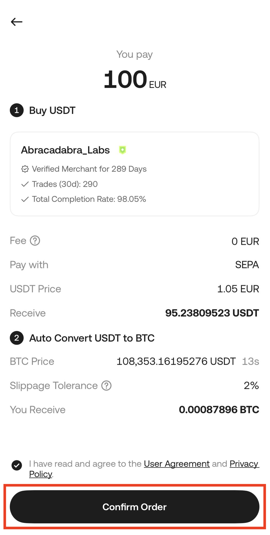 5. Review the order details, check the boxes to agree to the User Agreement and Privacy Policy, then tap the “Confirm Order” button to proceed.