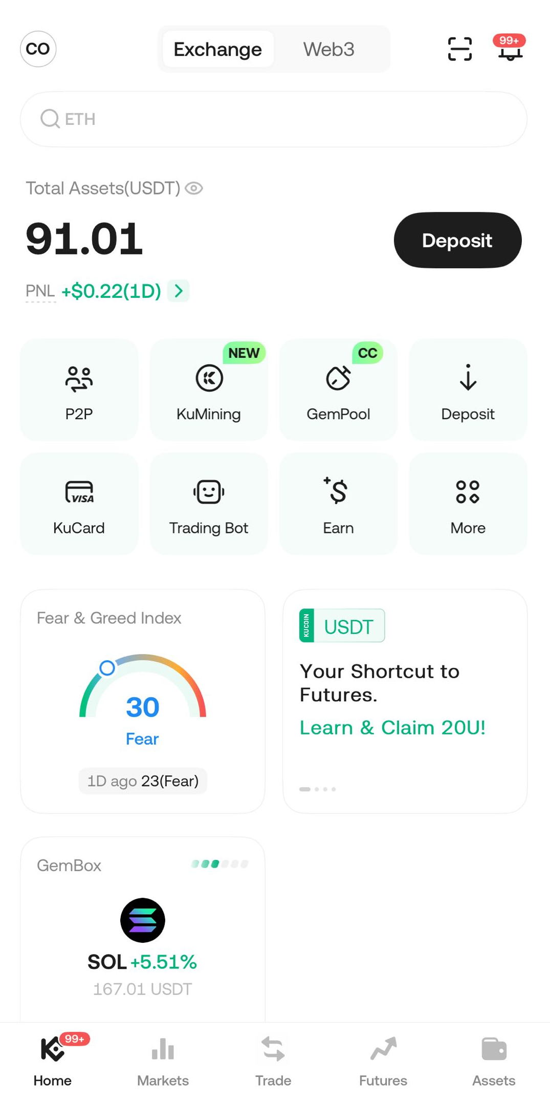 1. Log in to your KuCoin App with a verified account (KYC completed). Tap “P2P” on the homepage to enter the P2P trading section.