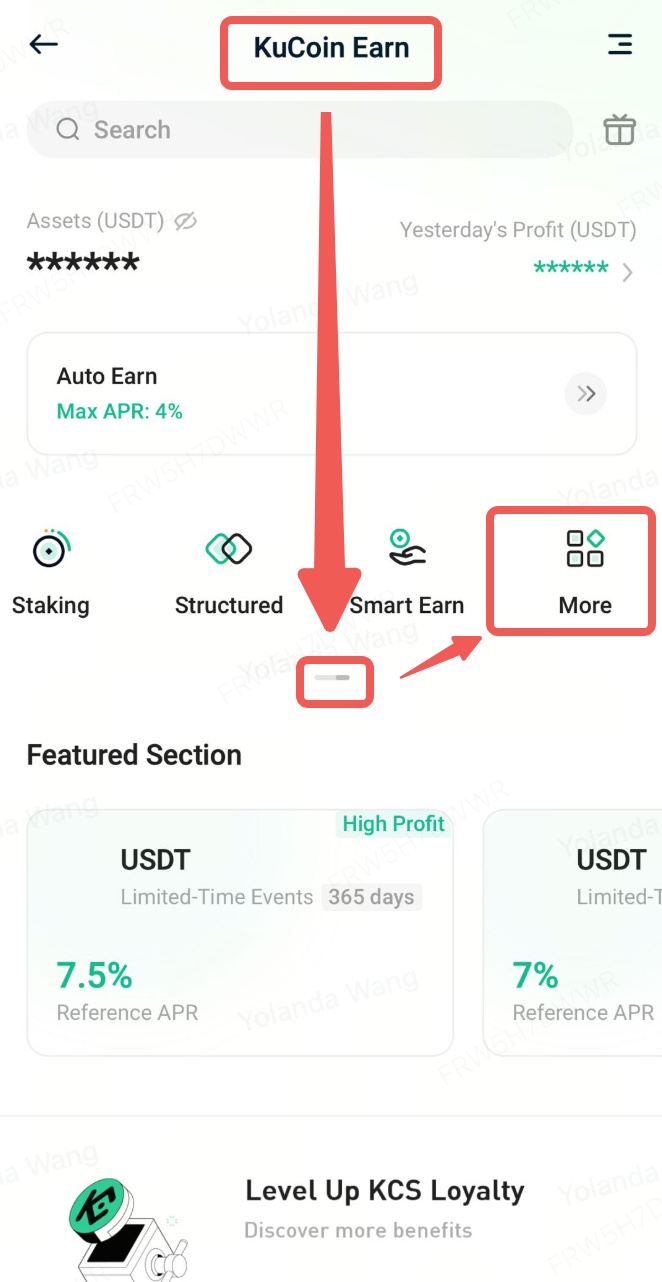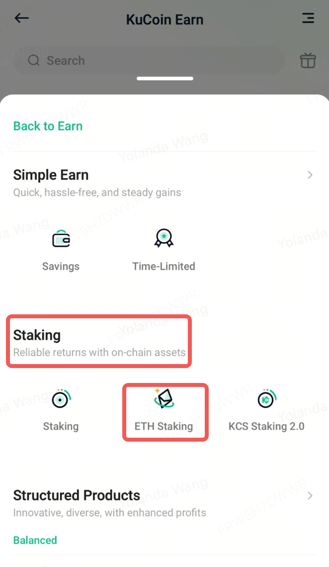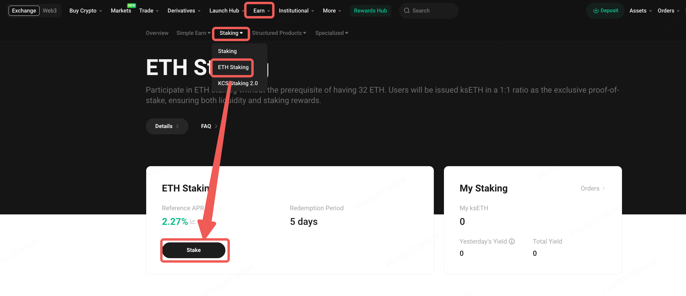 Go to KuCoin Earn, scroll for the product list, select Staking, choose ETH Staking and click Stake.