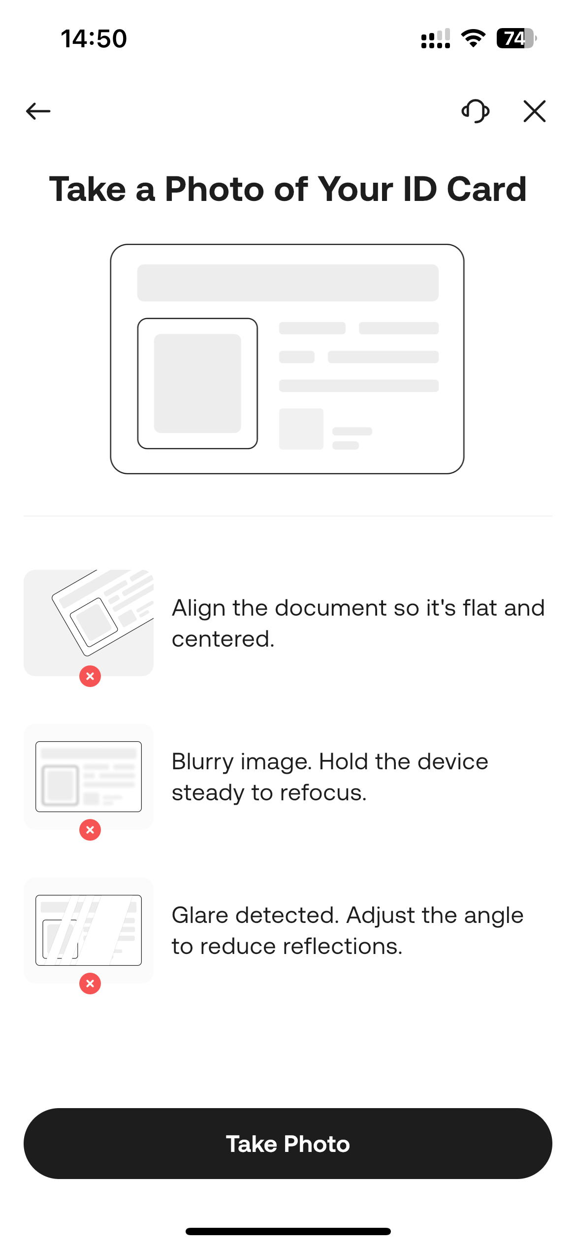 Please upload photos of your document using the selected type of ID. For this, you may need to have enabled camera permissions on your device.