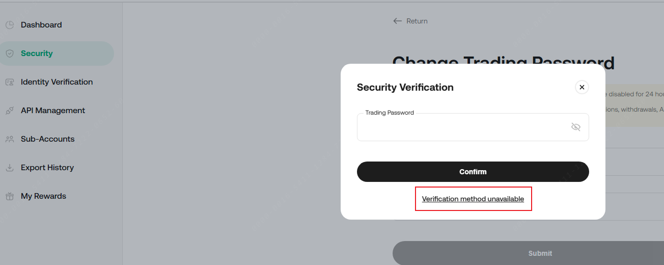 ii. Click "Verification method unavailable" on account security page while entering your email address or phone to confirm account (if you don't login) on the help center page iii. Choose"Trading Password" and confirm.Complete the Identity Verification process, following the instructions closely to request a manual password reset. Once you’ve appealed,your request will be processed in approximately 1–3 business days.