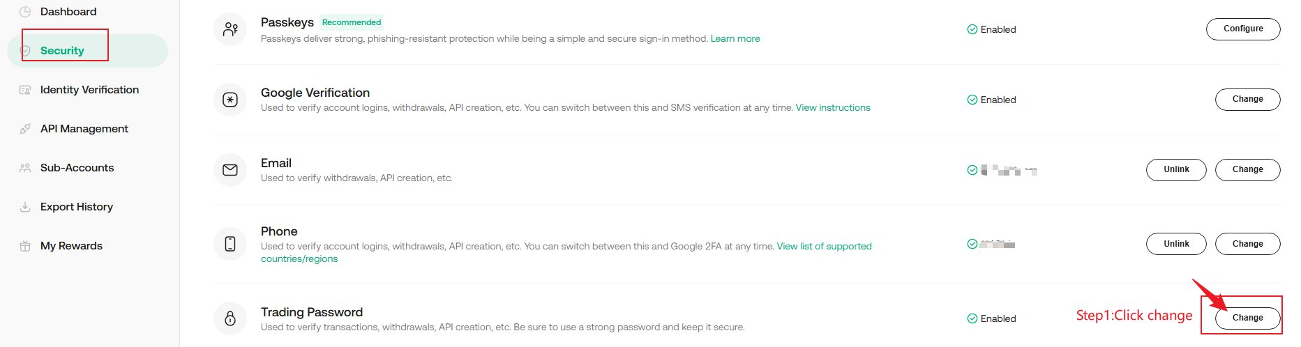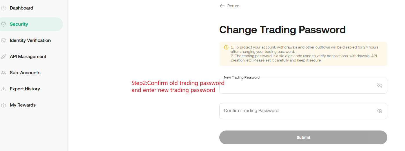 • Withdrawals, selling crypto via P2P, and sending Red Packets are disabled for 24 hours after changing your trading password to protect your assets.