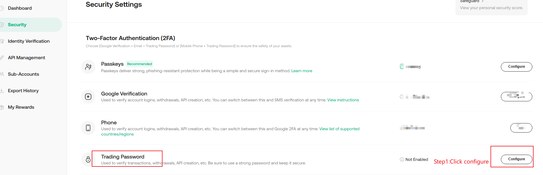 i. In Security Settings , look for Trading Password. Select Configure next to it.