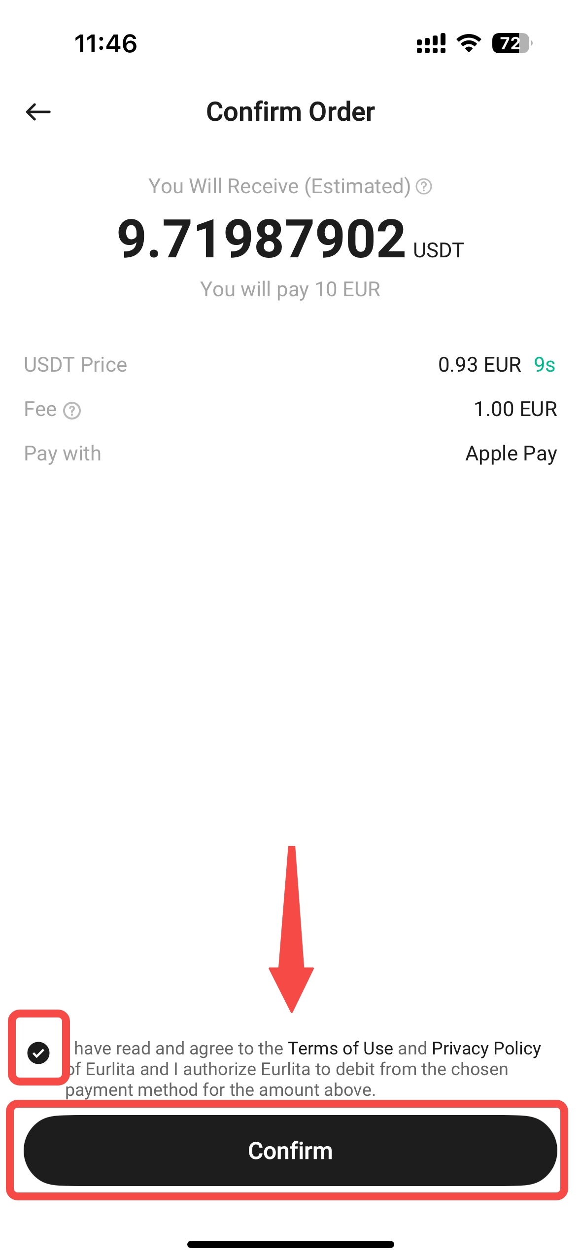 iii. Review the order: Confirm the amount you’ll pay and the amount of crypto you’ll receive. Select Confirm to proceed.