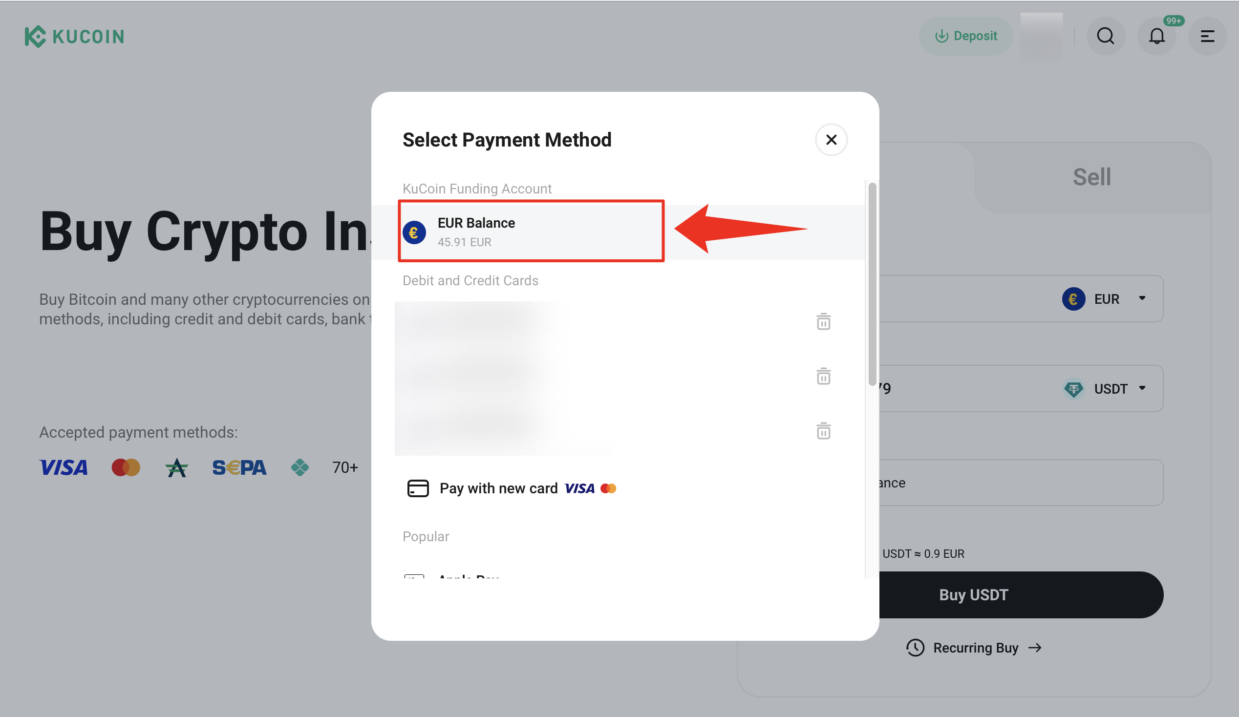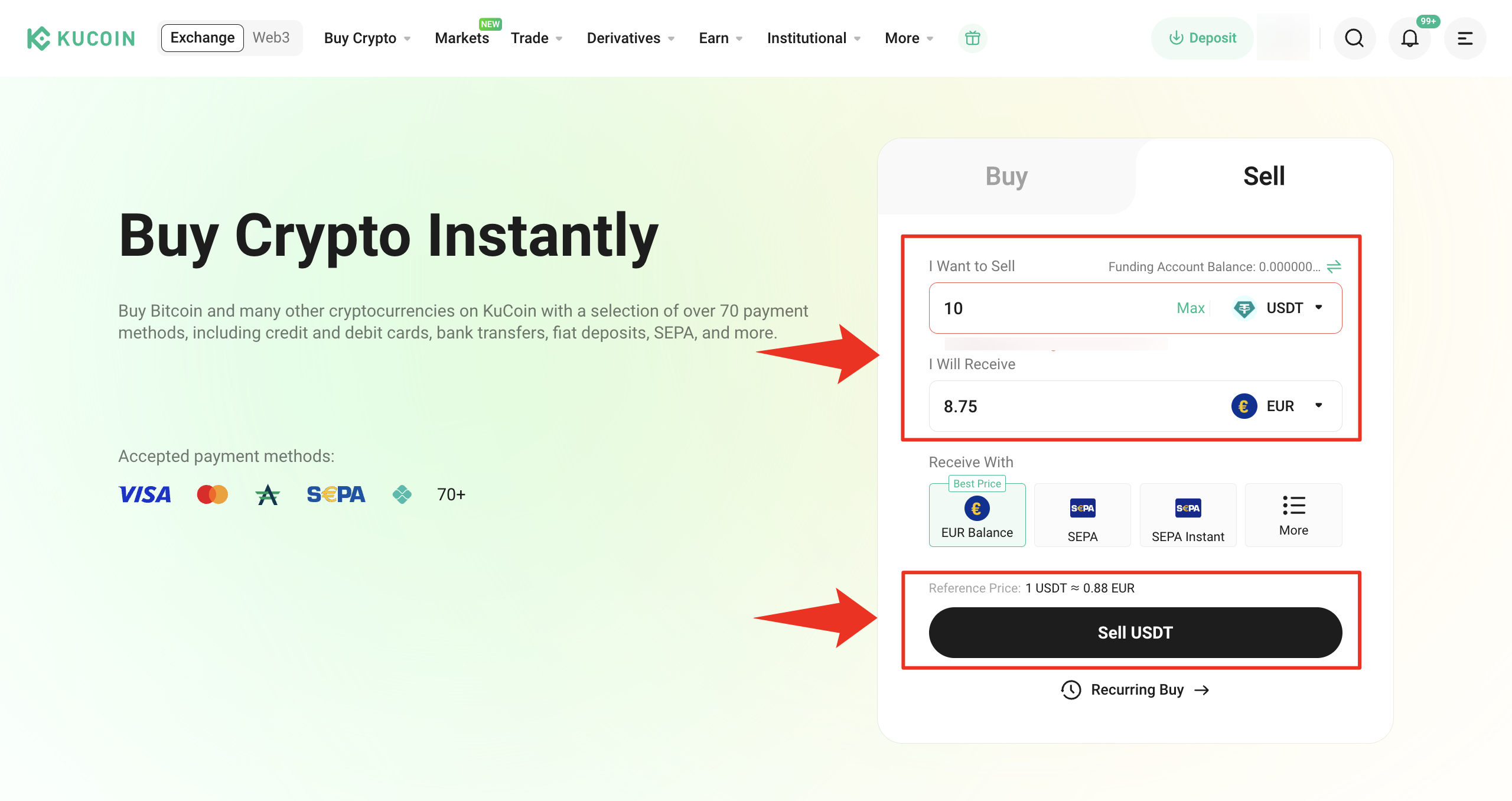 It means using the fiat funds in your KuCoin account to directly buy or sell cryptocurrencies. This allows you to quickly purchase crypto with your available fiat (e.g., EUR), or convert your crypto into fiat and deposit it back into your account balance.