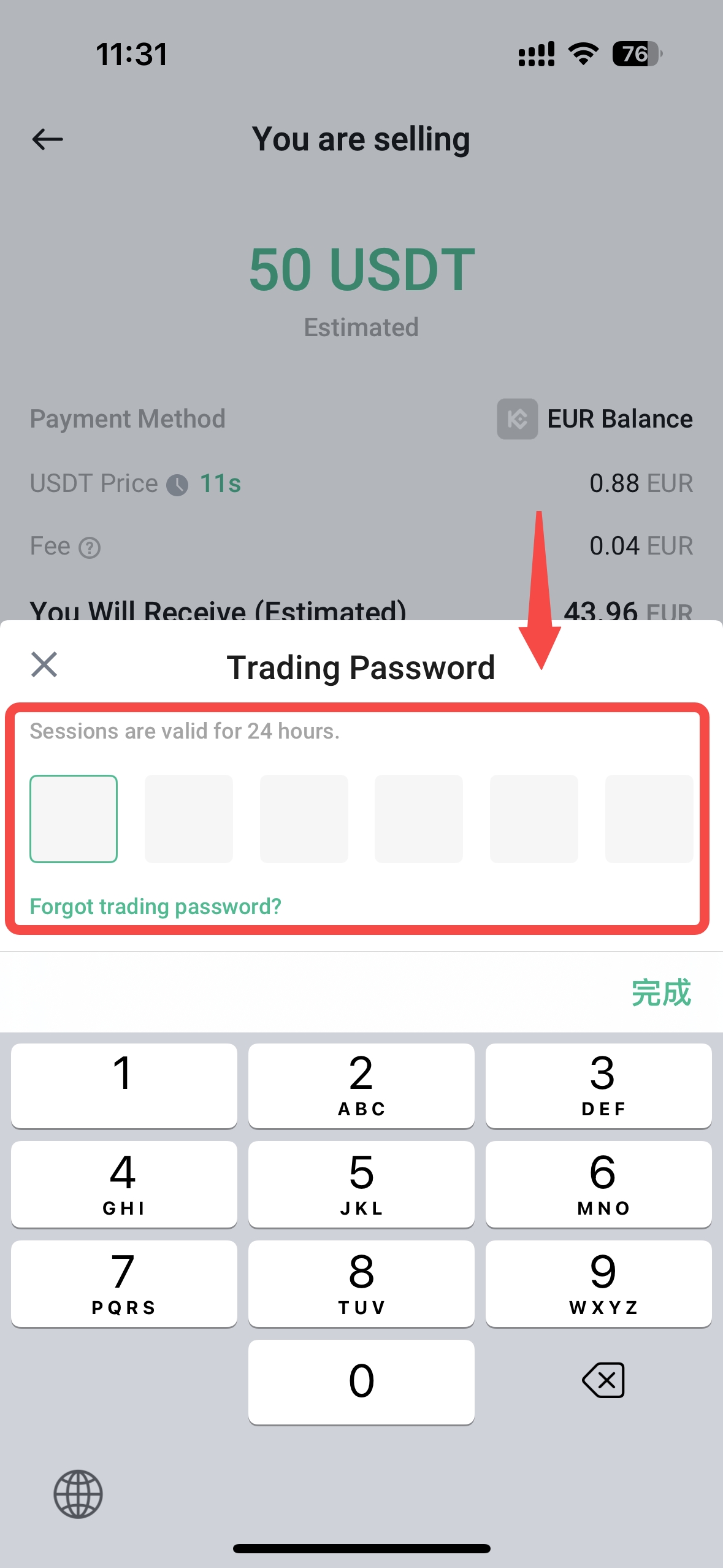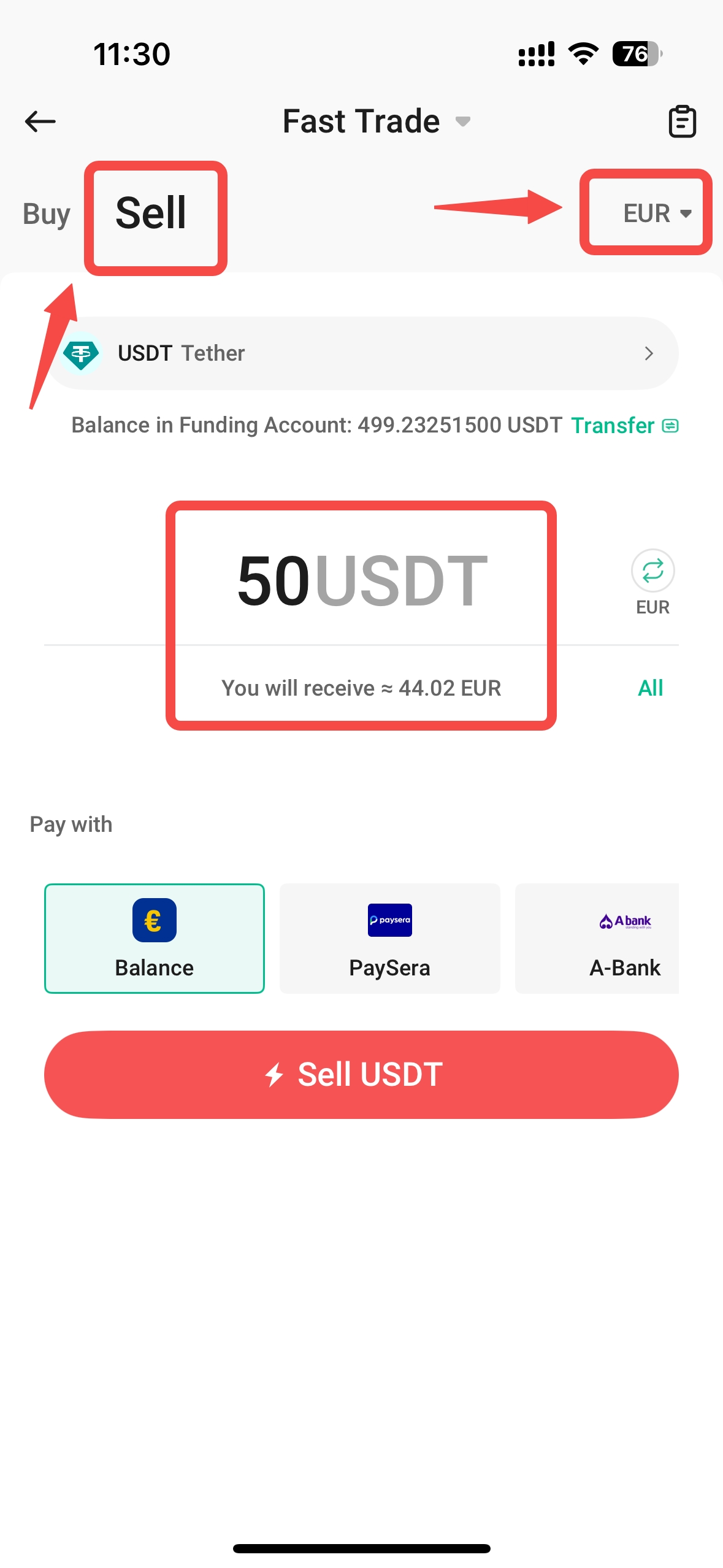 ii. Select Sell, and Choose your currency Tap Sell. Choose the cryptocurrency you want to sell (e.g., USDT) and the fiat currency to receive. Under Payment Method, select Fiat Balance (e.g., EUR Balance).