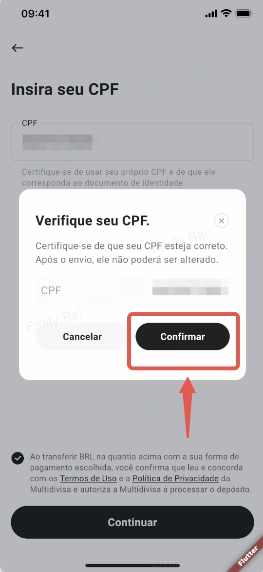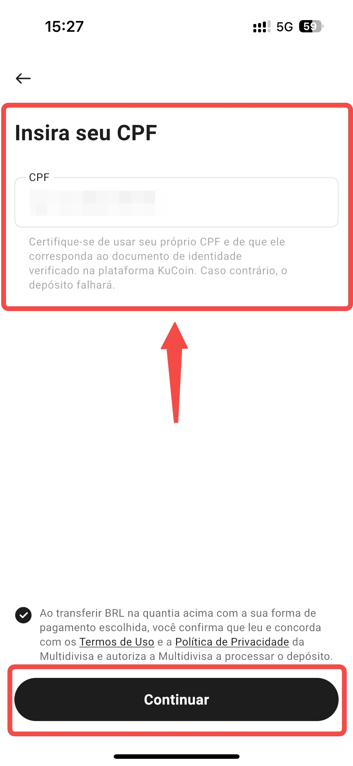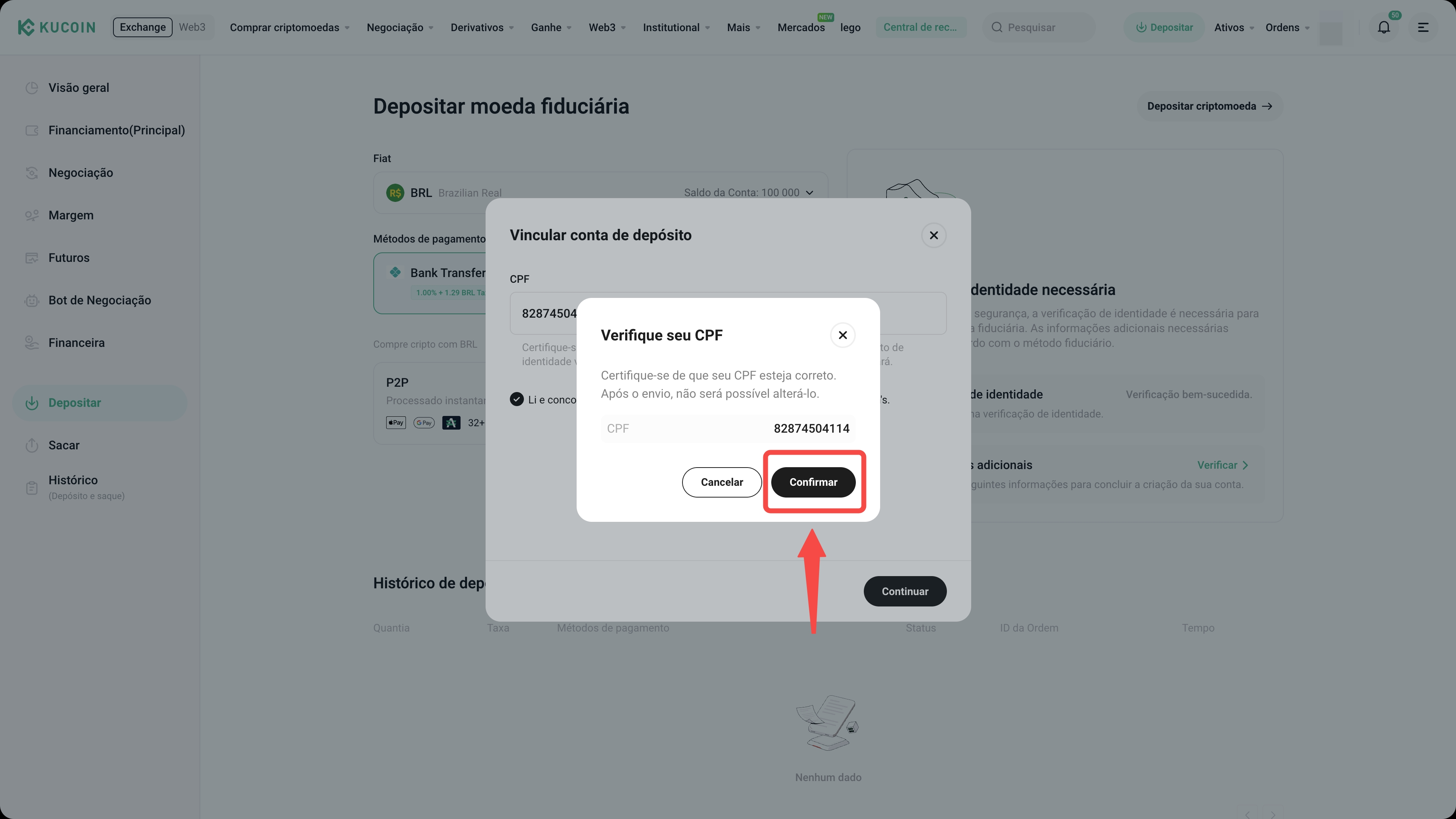 - Enter your CPF number and confirm that the information is accurate. ⚠️ Make sure the CPF holder matches the identity used in your KuCoin account’s Identity Verification (KYC). Mismatched CPF details will prevent funds from being credited successfully.