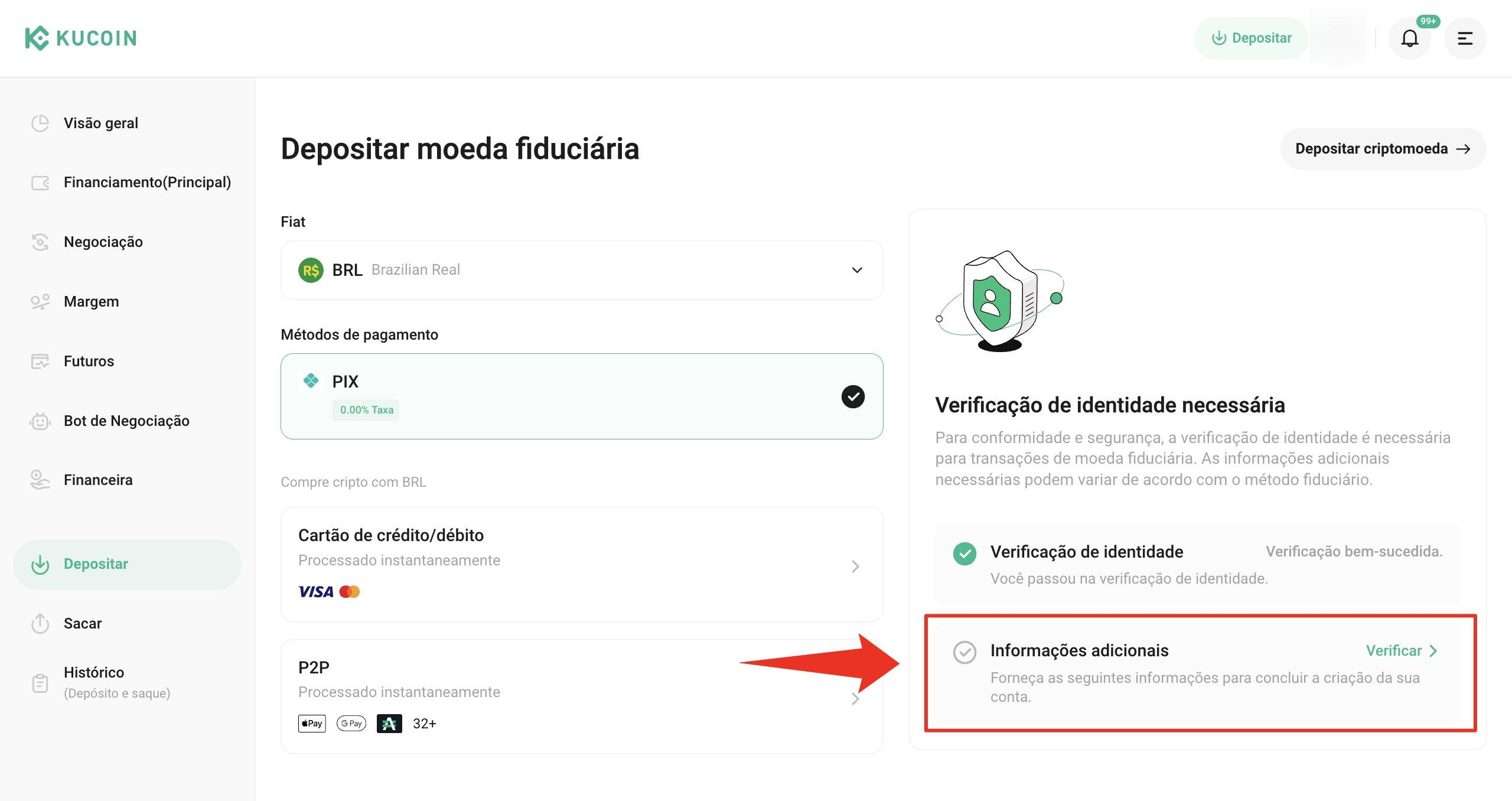 To comply with local financial regulations, KuCoin users must complete an additional Pix verification before making Pix deposits or withdrawals. KuCoin supports two types of Pix verification methods. The system will automatically select the most suitable one for your account. Please follow the on-screen instructions to complete the process.
