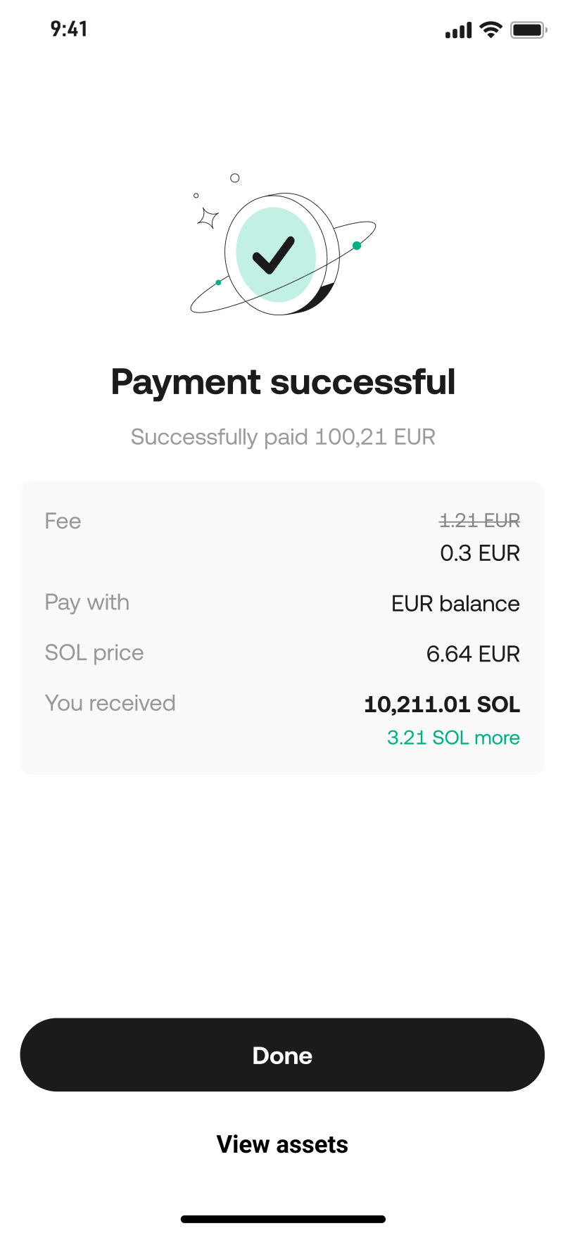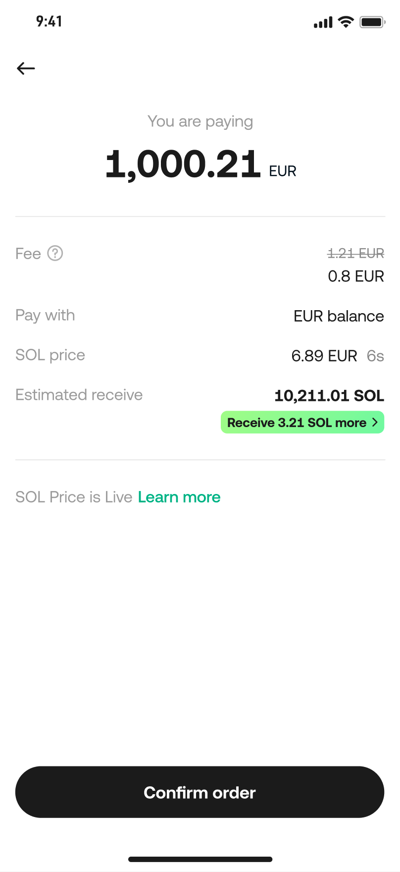 If the fee on an order is 10 EUR, the discount would be 10 * 50% = 5 EUR. User A receives crypto worth an additional 5 EUR.
