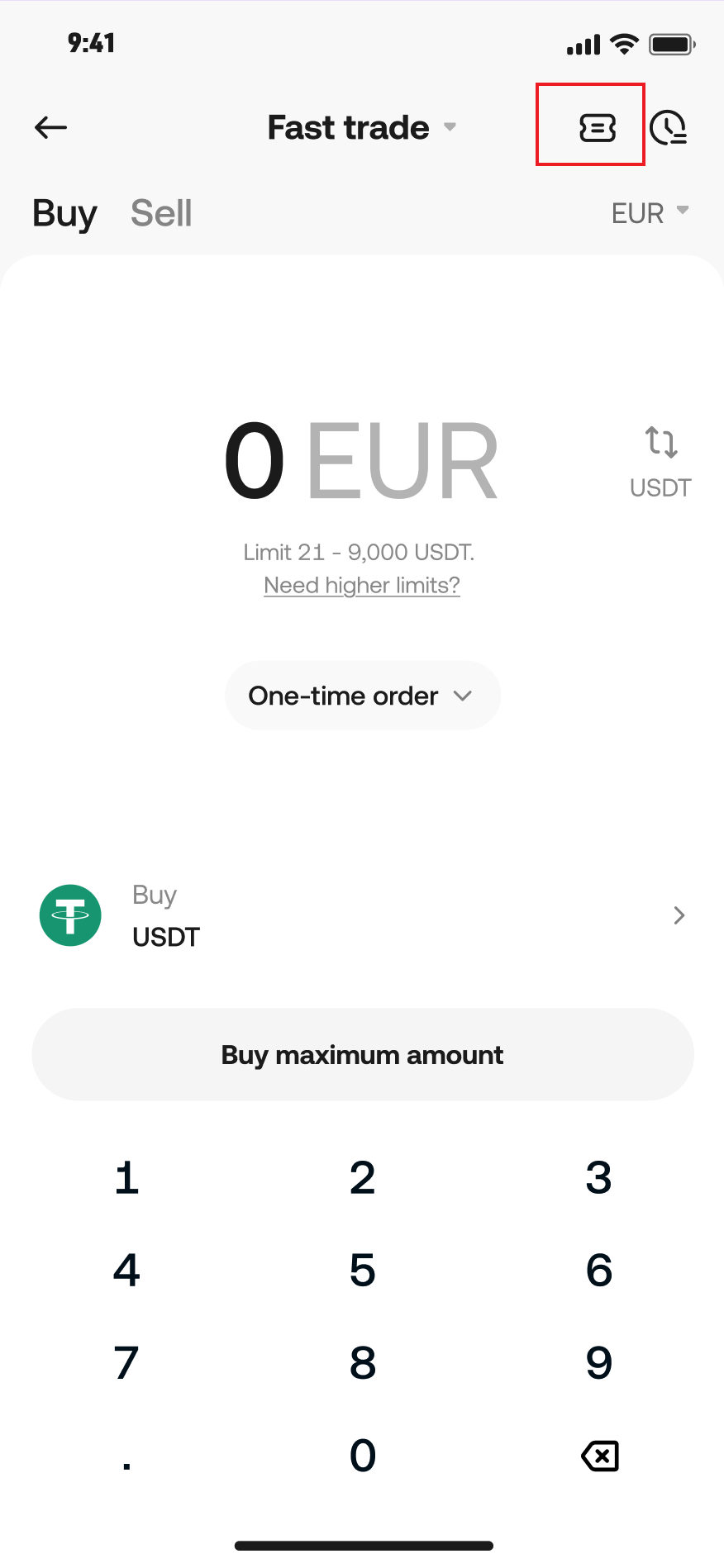 App: Tap “Add Funds” > “Buy Crypto” on the homepage, then tap the coupon icon at the top of the Fast Trade page.