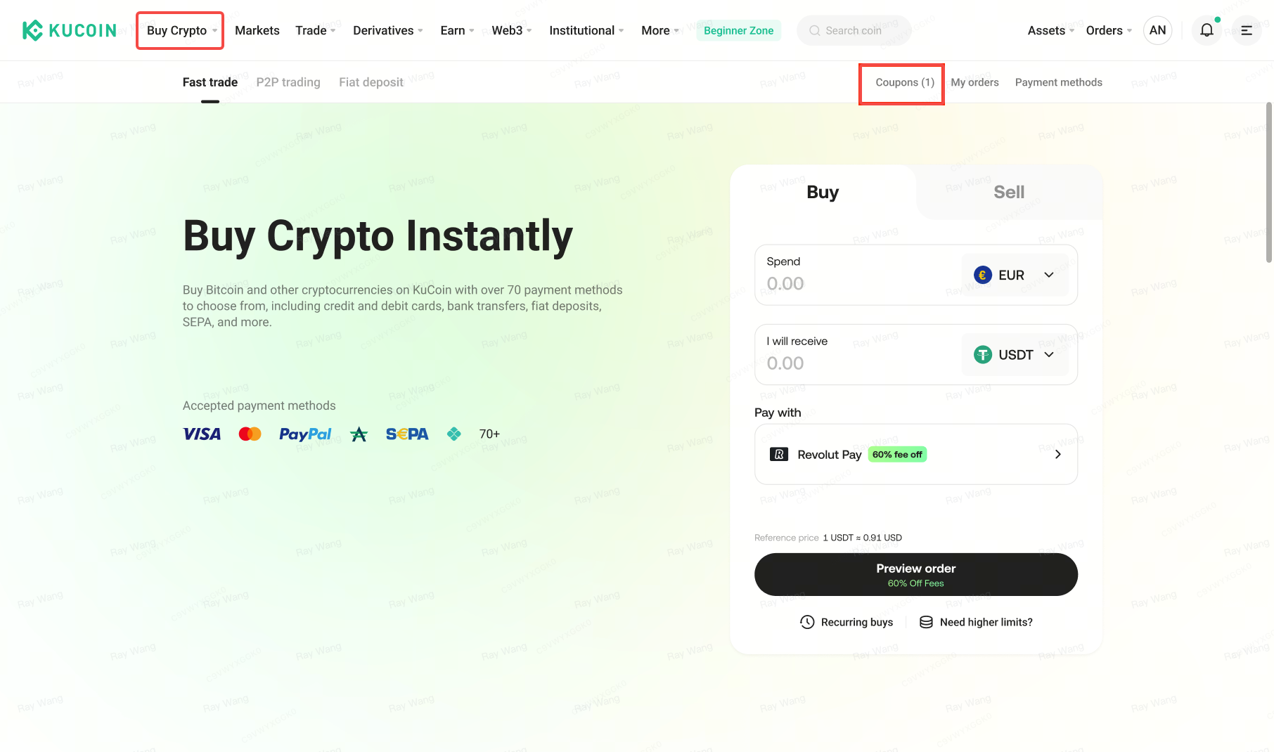 Buy Crypto Fee Coupons are discount coupons provided by KuCoin to reduce the trading fees incurred when purchasing cryptocurrencies. By applying these coupons, users can enjoy lower fees on crypto purchases, gaining greater value when buying through KuCoin. These coupons are applicable to most payment methods in Fast Trade, such as Credit/Debit Cards, Revolut Pay, Apple Pay, Blik, and buy crypto with fiat balance.