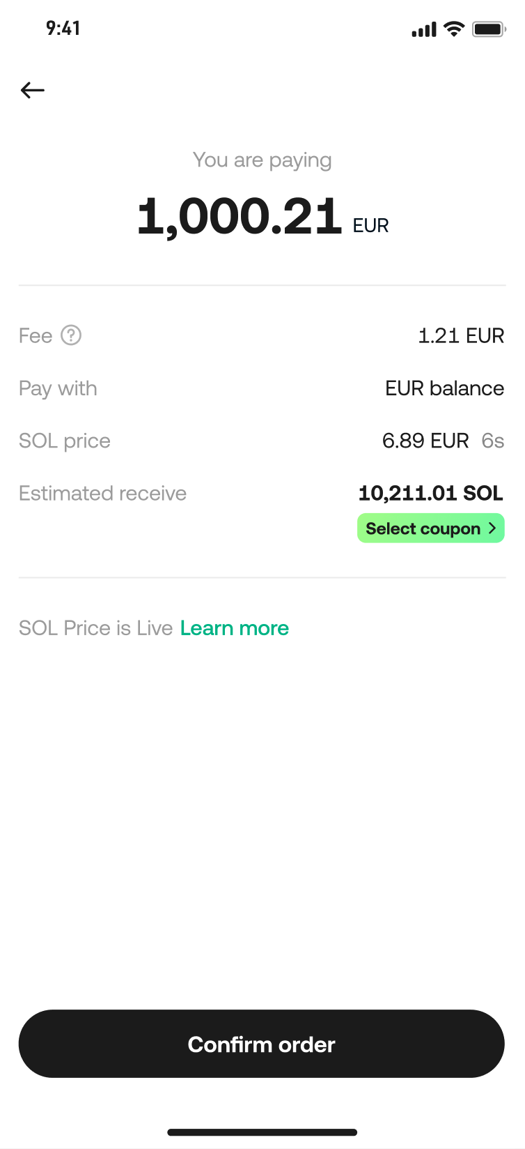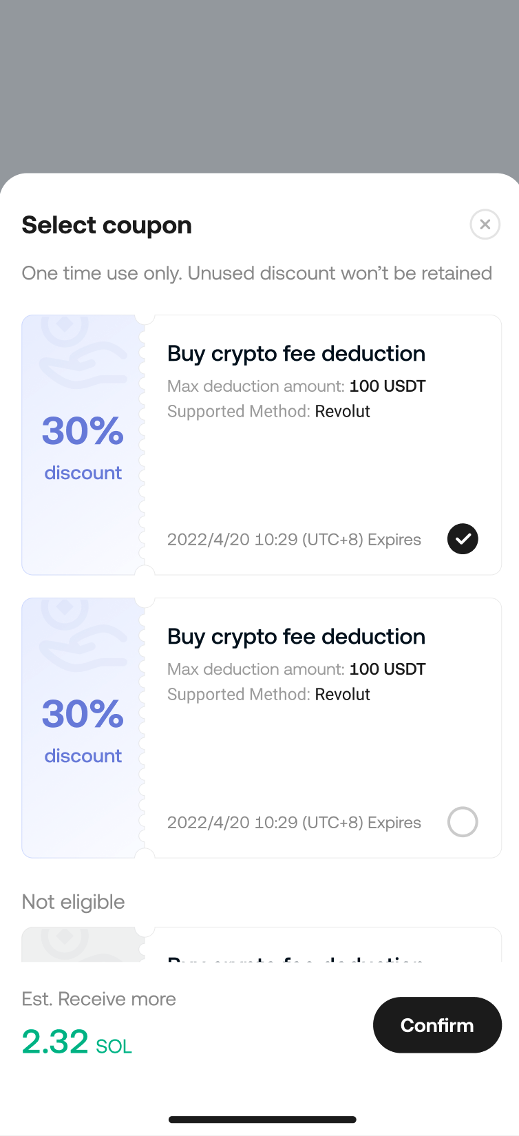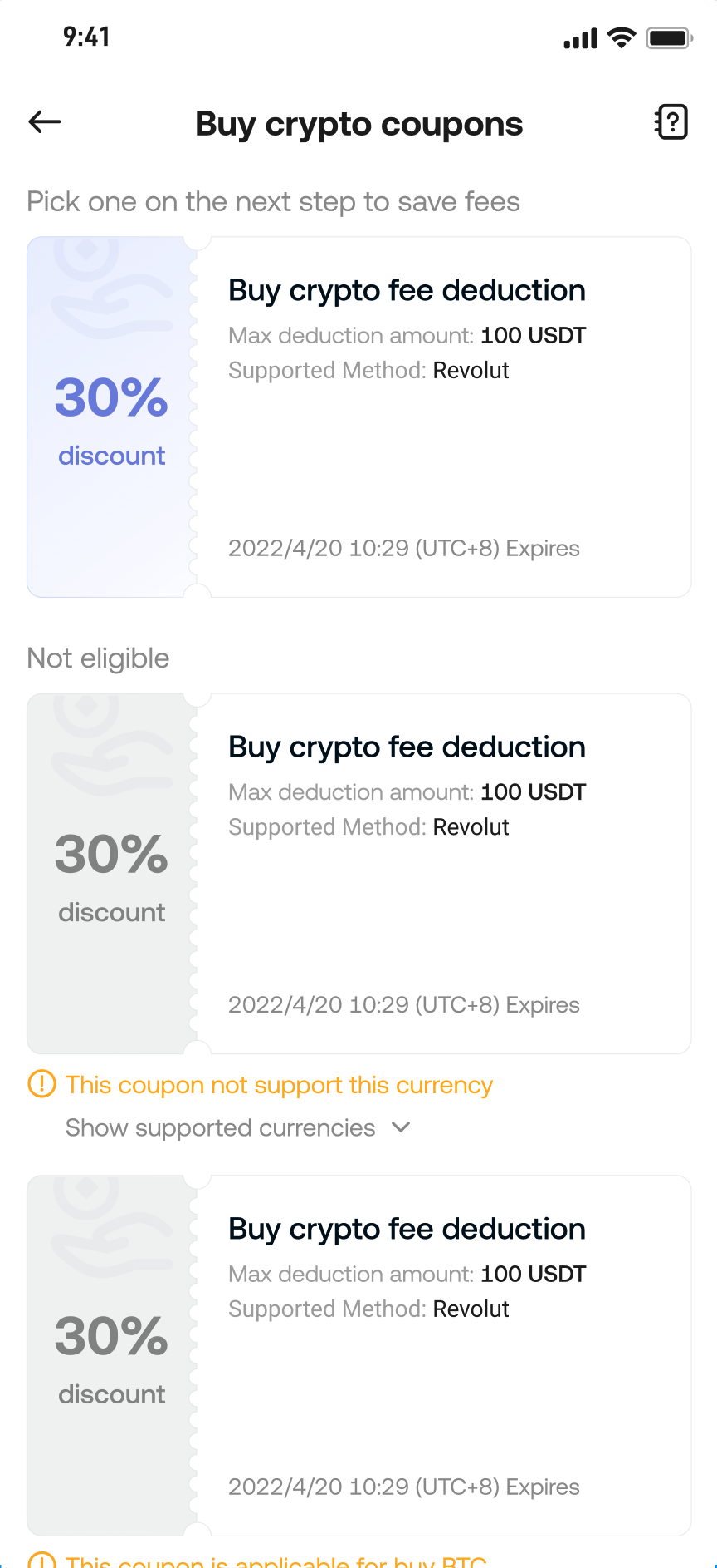The following is a step-by-step example of how to use a Buy Crypto Fee Coupon (images for reference only).