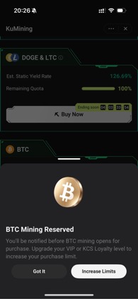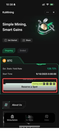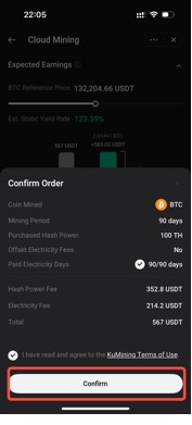 Log in to your account, go to the App homepage, select KuMining to enter the Cloud Mining product page Mining Market, and choose the target coin BTC or LTC.