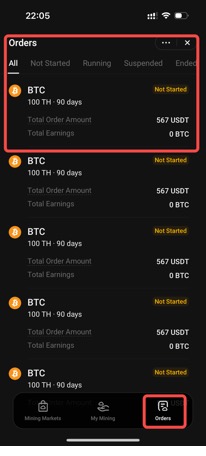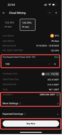 For details on purchase limits, orders, and earnings, please refer to the Cloud Mining FAQ.