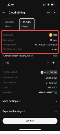 Select Buy Now to enter the product's details page, where you can view: the period of the plan, hash power price, electricity fees, available purchase limit, and the estimated earnings.