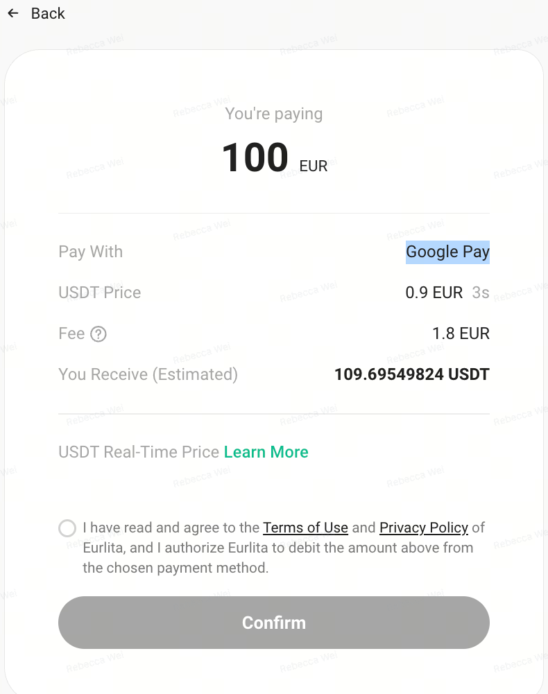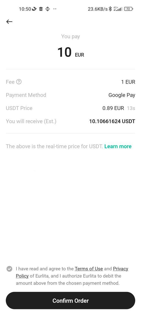 iii. Review the order: Confirm the amount you wish to pay and the amount of crypto you want to receive. Then, select Confirm to proceed.