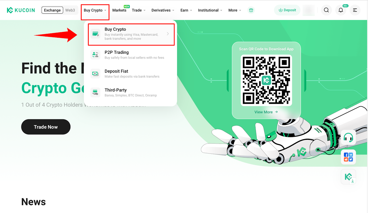 i. Log in to your KuCoin account and tap Buy Crypto directly on the homepage, or go to Assets → Deposit → Buy Crypto