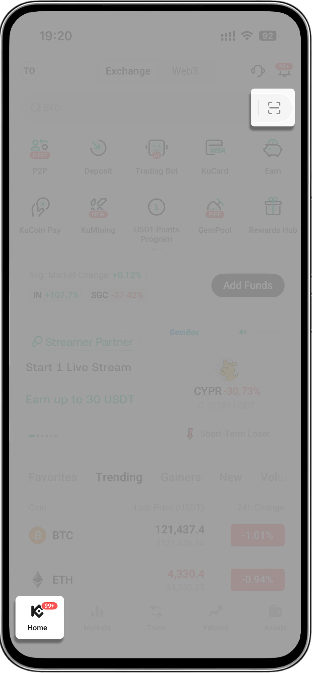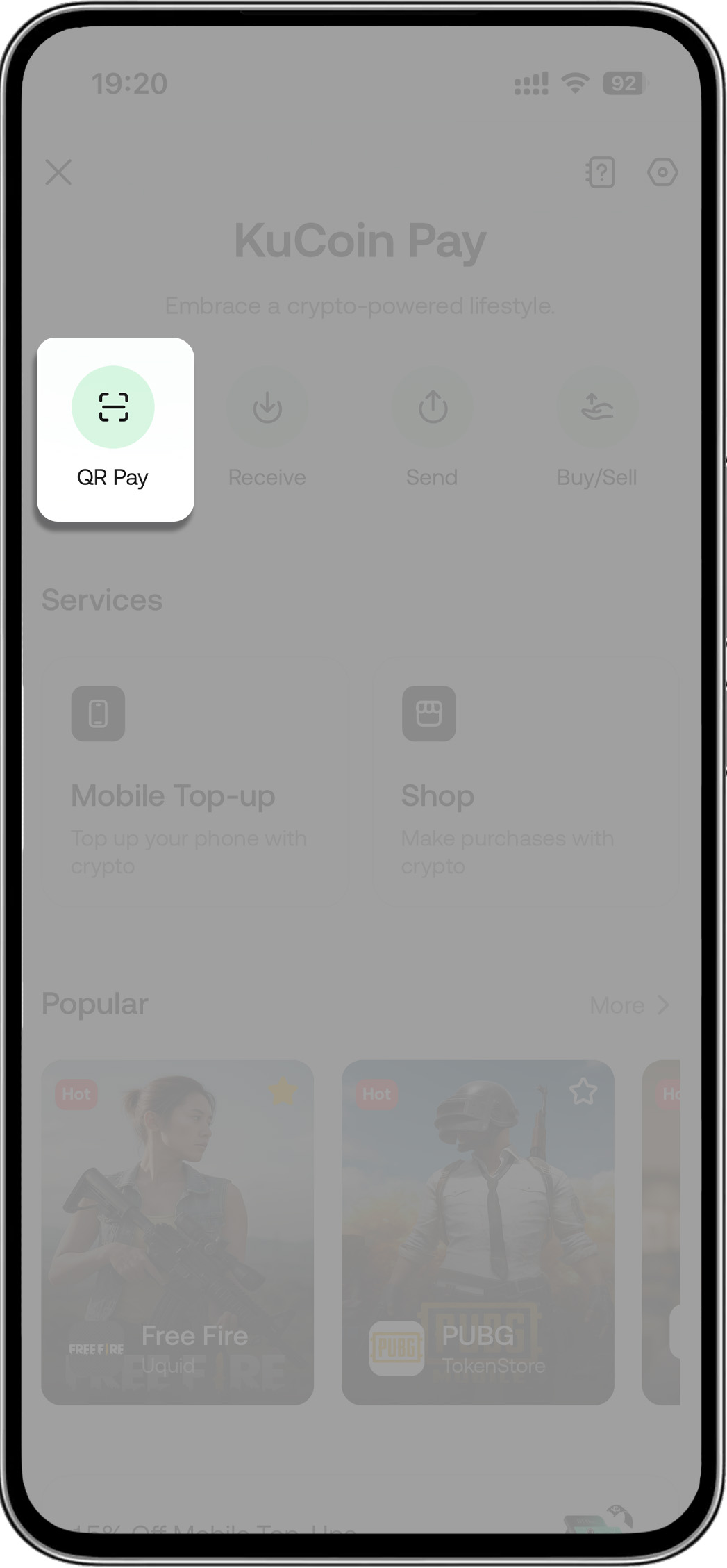 - Step 1: Log in to the KuCoin App > Tap scan icon (accessible from home screen or within KuCoin Pay) > Scan the merchant’s QR code to pay