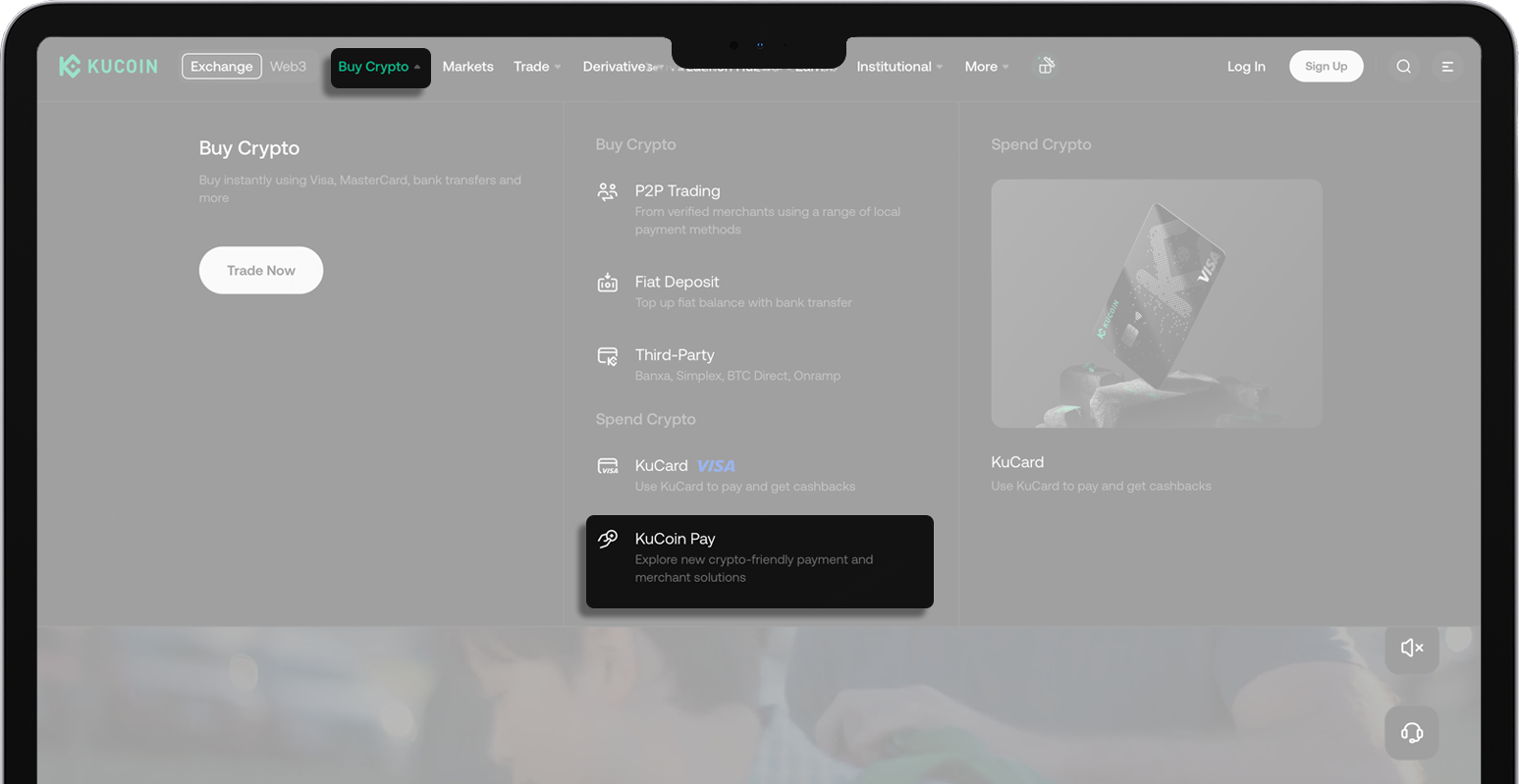 1. Open KuCoin Website > Click "Buy Crypto"(top navigation bar) > Select "KuCoin Pay"
