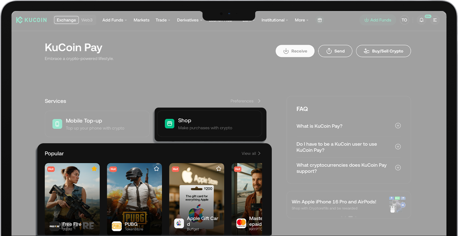 KuCoin Pay partners with leading online merchants including: TokenStore, Coinsbee, Cryptorefills, KryptoMate, Uquid, Buffget, Bittopup, UMY and more — enabling you to pay seamlessly using your crypto balance for Mobile Services, Game Gift Cards, Entertainment Premium Cards, E-commerce Rewarble Card, Travel, Hotel Booking and so on.