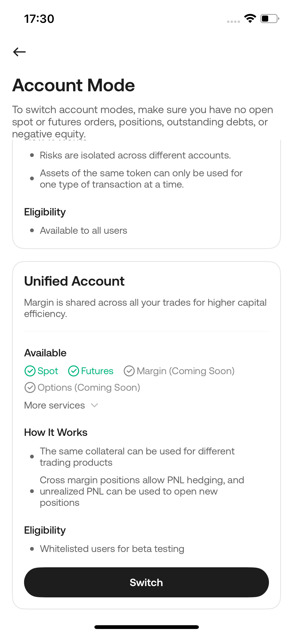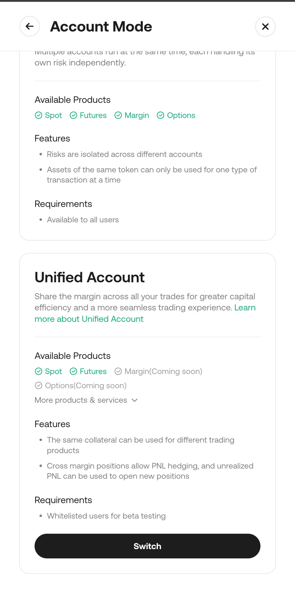The master account and sub-accounts can each be set to different account modes. For example, the master account could be on Unified Account mode, while the sub-account could remain on Classic Account mode.