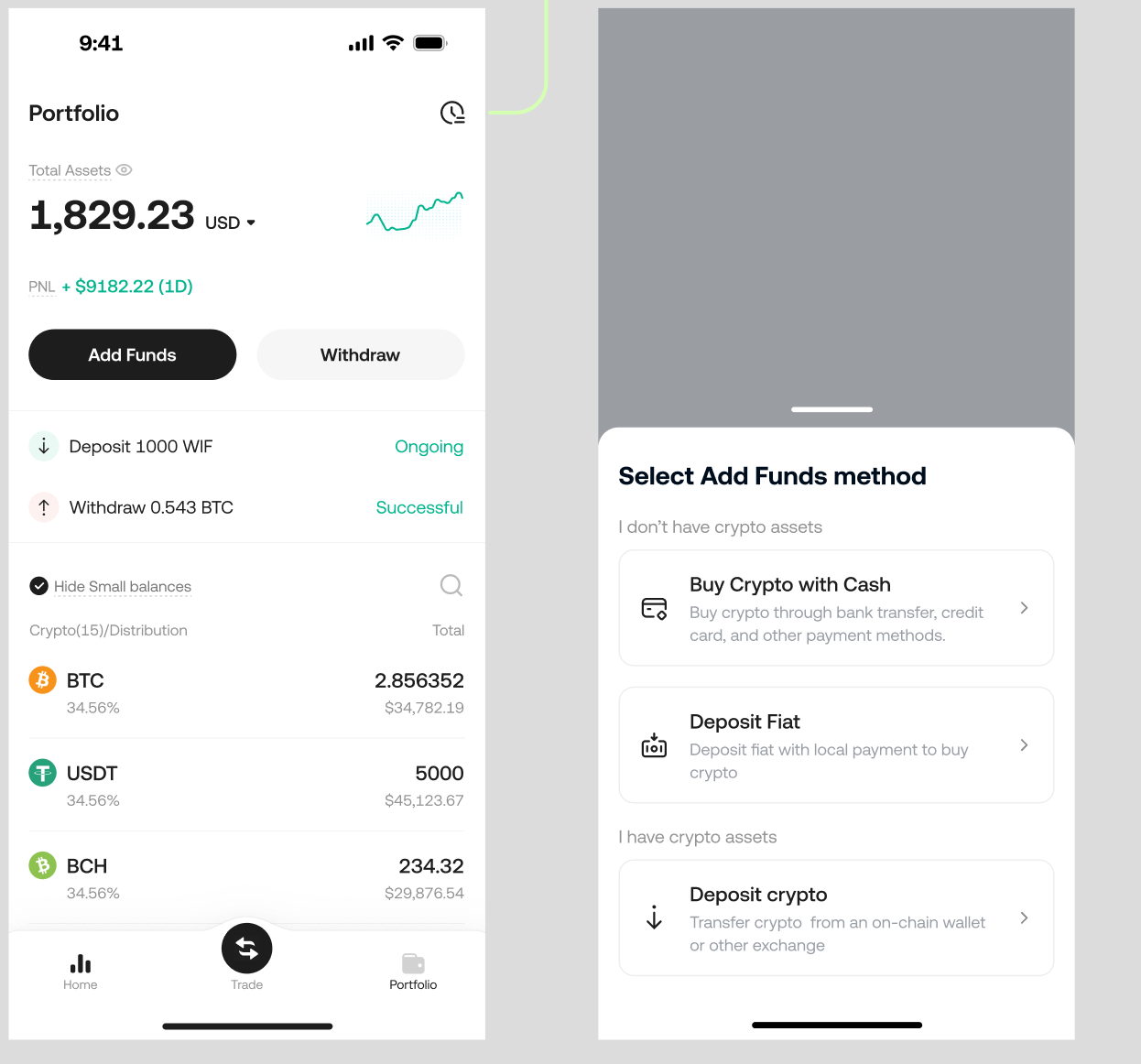 On the KuCoin homepage or Assets page, click "Add Funds," then select "Crypto Deposit" from the expanded menu.