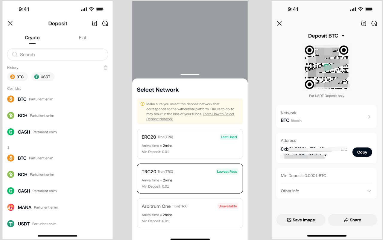 Select the correct deposit network. The selected network must match the network used by the withdrawing platform. Otherwise, your funds may be lost and unrecoverable.