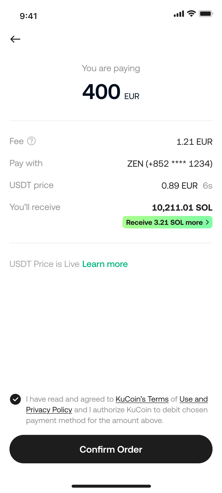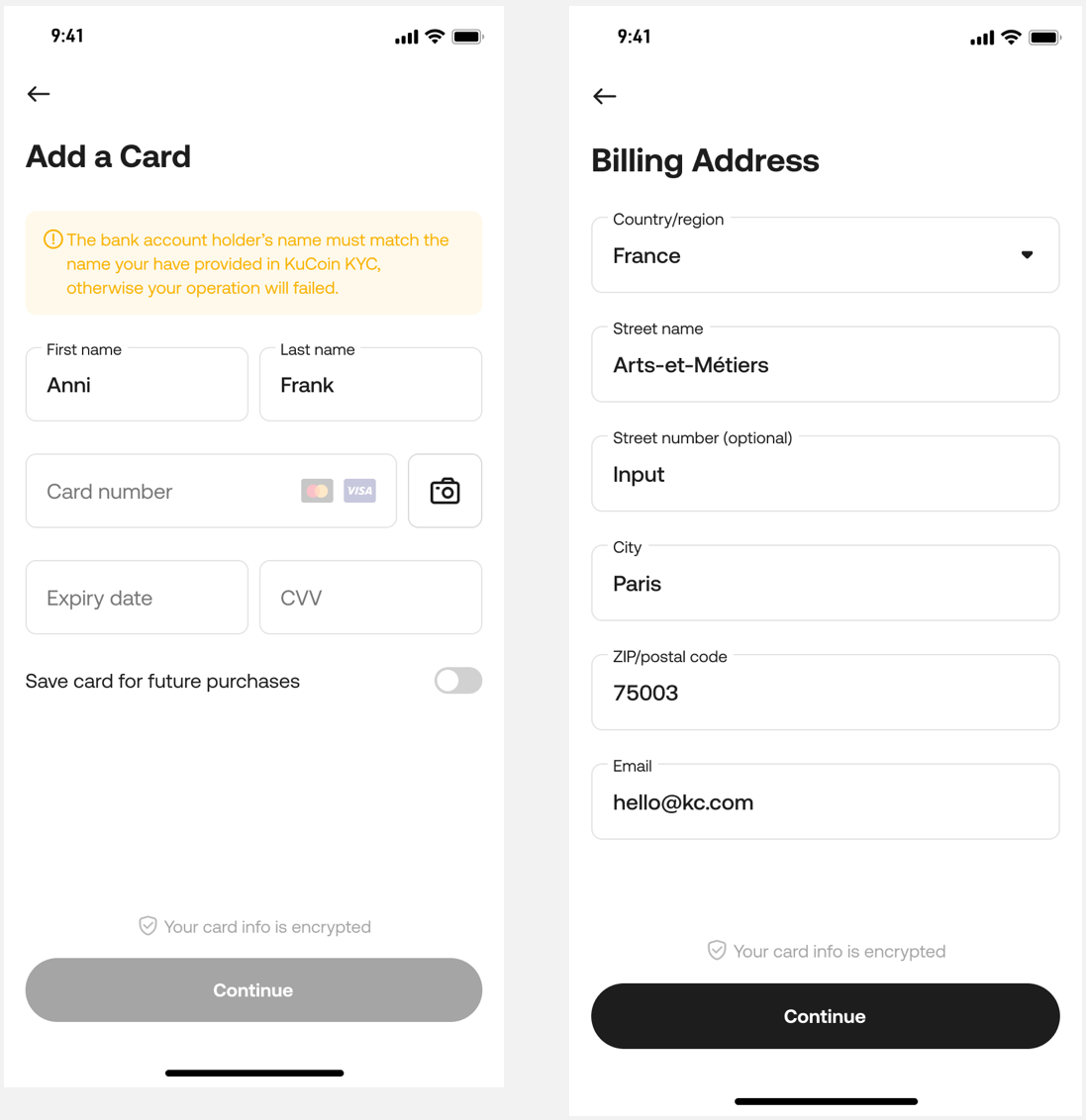 2.3 On your first purchase, you will need to complete the process of binding your payment account/card. KuCoin supports various payment channels, simply follow the on-screen instructions to complete the binding.