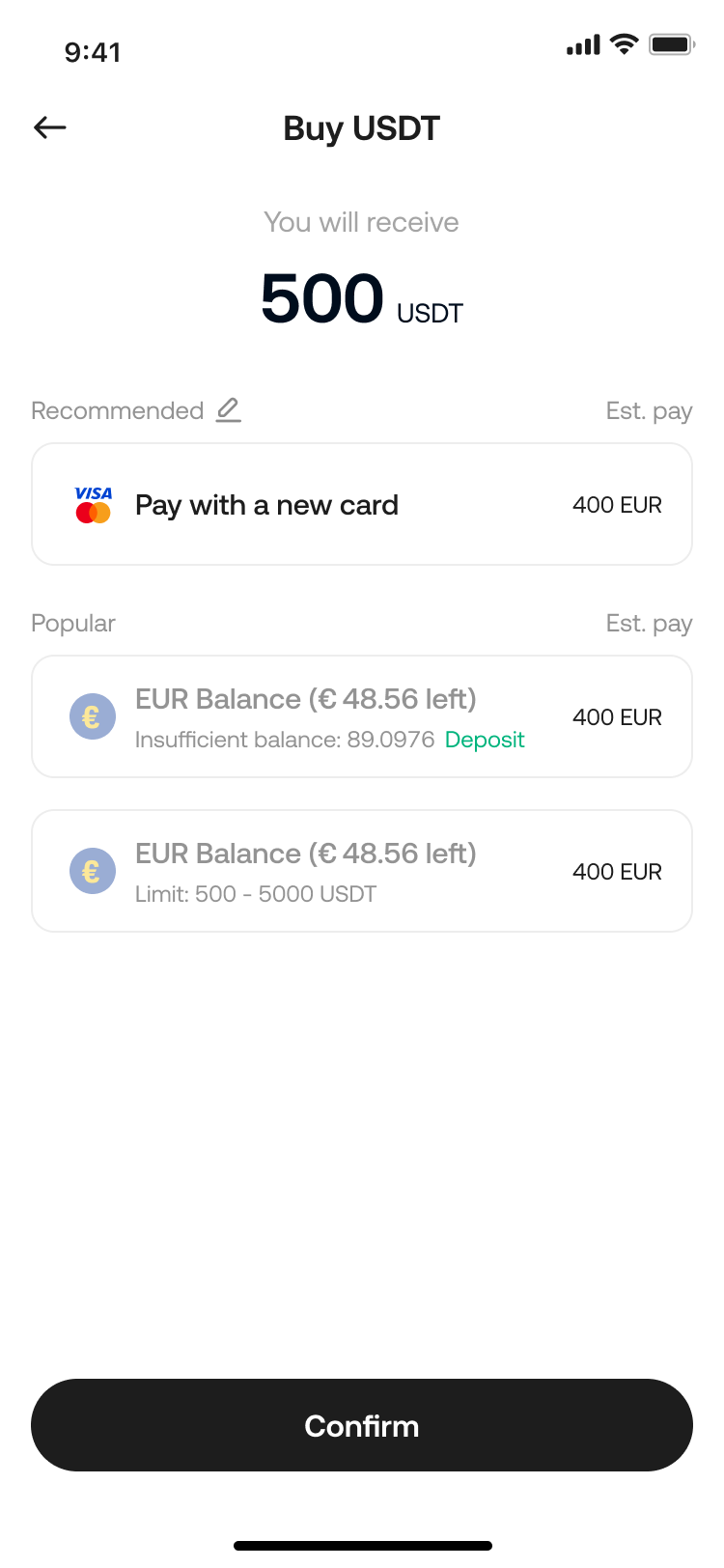 2.1 Select your payment fiat currency and the cryptocurrency you want to purchase, then enter the amount.