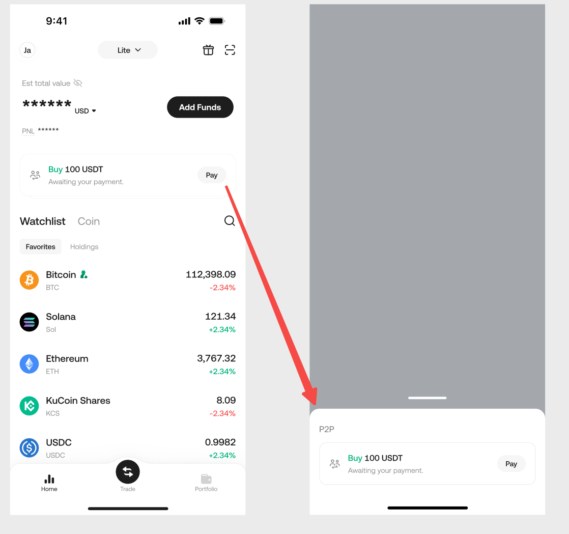 When you buy/sell cryptocurrency on the KuCoin Lite Version and select a payment method marked with "P2P", the system will generate a corresponding P2P order. This type of order requires you to leave the KuCoin app and open another application to complete the payment to the recipient (for buying) or to confirm receipt of payment from the payer (for selling). Let's take a look at the process and key considerations for P2P orders.