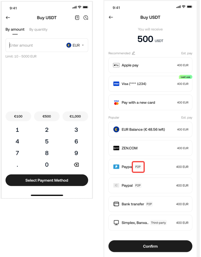 On the Fast Trade page, set the amount and other details for the cryptocurrency you wish to purchase, and then proceed to the payment method selection page. If the payment method you choose has "P2P" indicated, it means you have selected a P2P channel. Click "Confirm" on the subsequent order confirmation page to finalize the creation of the P2P order.