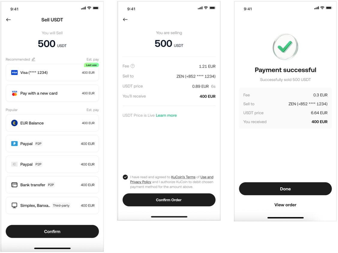 1.3 Select your desired payment method, then you will be directed to the order confirmation page. Please review the sell order details and read the terms carefully before tapping the confirm button.