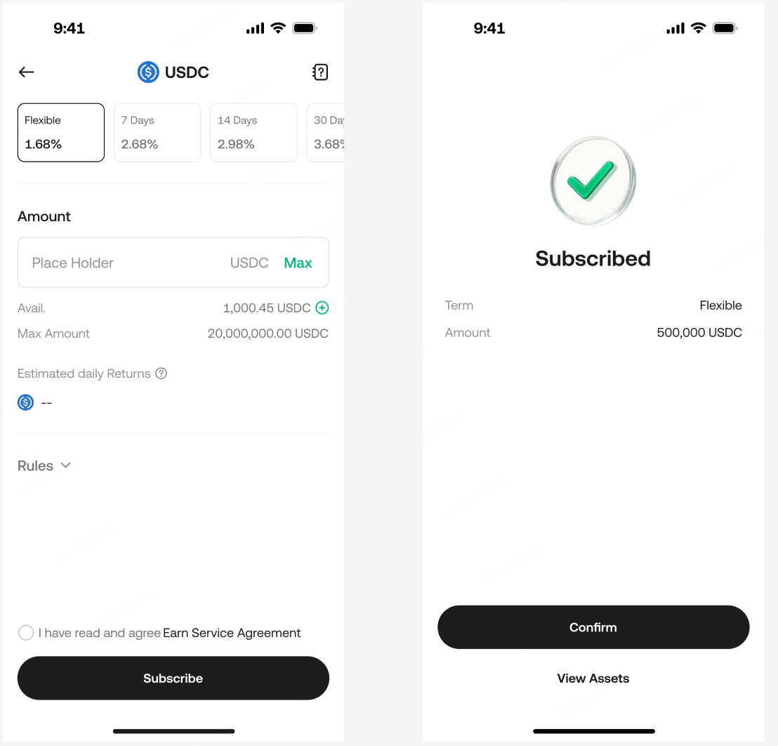Flexible Term earn allows you to redeem your assets at any time as needed, while fixed-term earn requires you to lock your assets for a fixed period. In return, Fixed-Term can typically receive higher yields compared to Flexible Term. Please note that if you redeem your assets from Fixed-Term earn early, you will be unable to receive any accumulated yields.