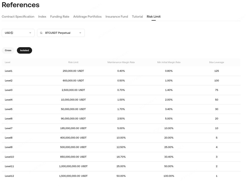 Isolated margin mode still uses risk limits, and each level has the following parameters:
