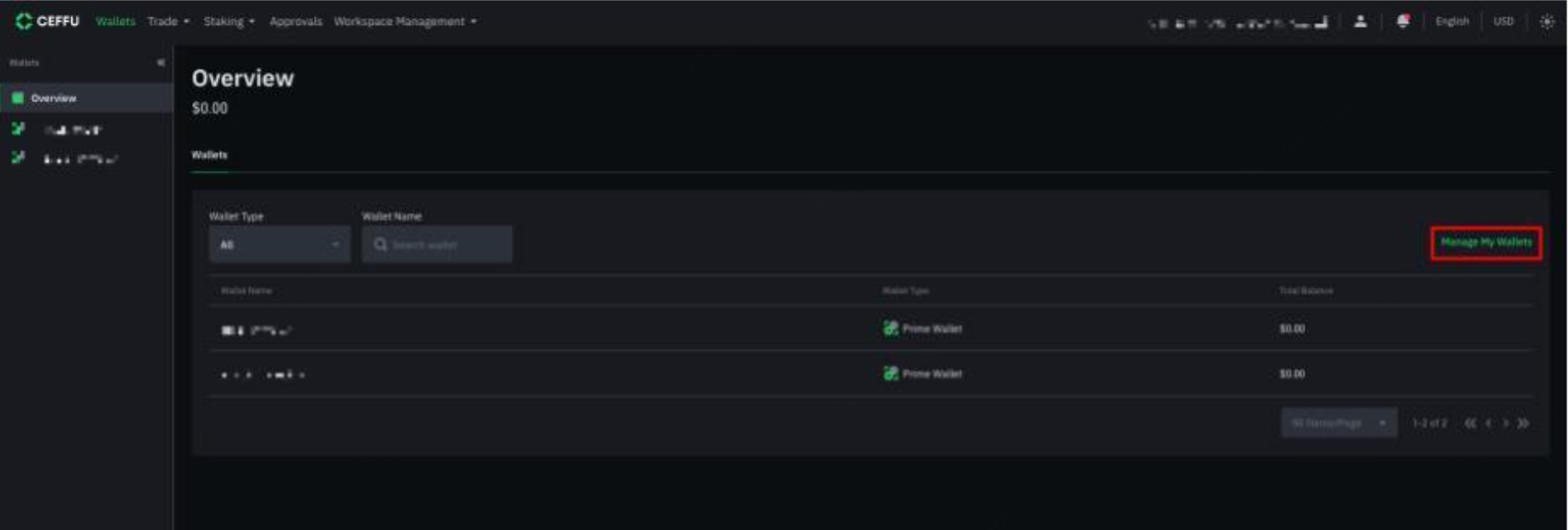 Login to your Ceffu account. Select ‘Manage My Wallets’ to start creating new wallets.