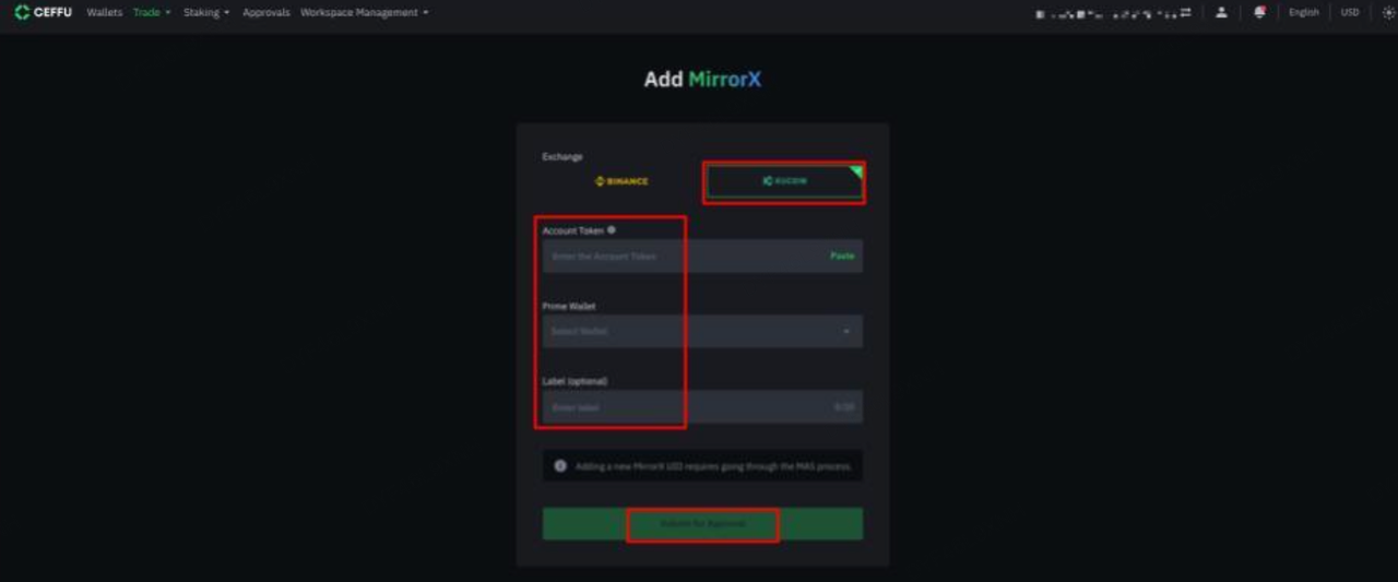 Select ‘Trade’ and ‘MirrorX’ on Ceffu UI. Select KuCoin and enter the Sub-Account Token, Prime Wallet Name and Label (optional). Select ‘Submit for Approval’ to proceed.