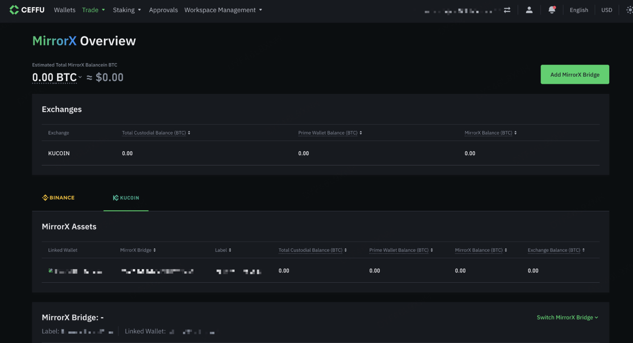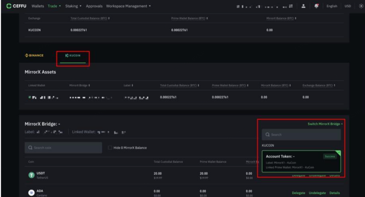 On the Ceffu UI, navigate to Trade and select MirrorX. Then choose KuCoin and the specific MirrorX relationship you would like to delegate.