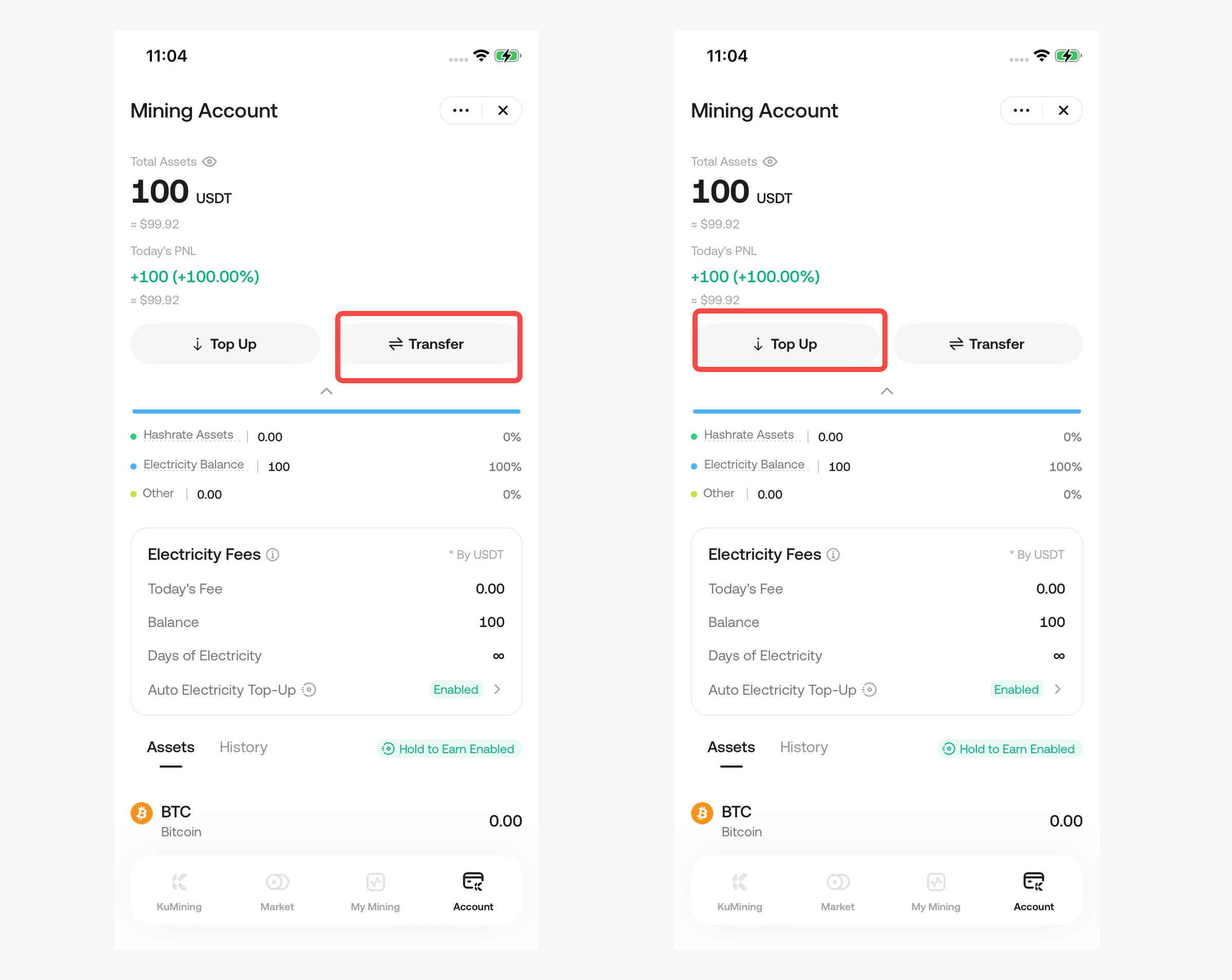 This feature automatically transfers USDT from your funds account to the Mining Account when electricity fees are insufficient. ⚠️ If your funds account USDT balance is insufficient, the auto transfer will fail, and a reminder will be triggered.