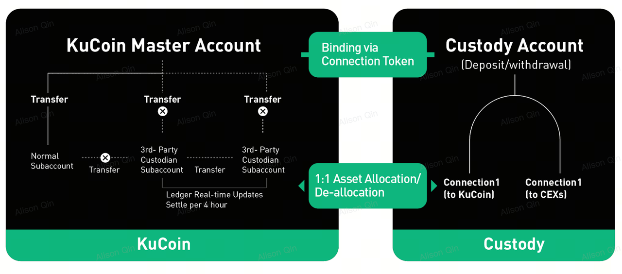 ผ่านการผสานรวมนี้ ลูกค้าที่เป็นสถาบันสามารถตั้งค่าบัญชีย่อย Custodian Sub-Accountภายใต้บัญชีหลักของ KuCoin ได้โดยตรง โดยบัญชีย่อย Custodian Sub-Account แต่ละบัญชีจะเชื่อมโยงโดยตรงแบบ 1:1กับบัญชีCactus ของลูกค้า เพื่อให้มีการมอบหมายสินทรัพย์ที่โปร่งใสและสามารถตรวจสอบได้