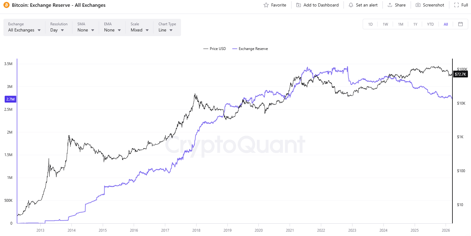 อย่างสุดท้ายแต่ไม่ท้ายสุด เราจะพูดถึงปริมาณ BTC ที่ถืออยู่บนแพลตฟอร์มแลกเปลี่ยนคริปโตที่ลดลง วันนี้ (18 มีนาคม) ตัวเลขลดลงแตะระดับต่ำสุดในรอบหกปีที่ประมาณ 2.72 ล้านหน่วย สิ่งนี้บ่งชี้ว่านักลงทุนยังคงละทิ้งแพลตฟอร์มแบบกลางใจเพื่อหันมาใช้วิธีการจัดการสินทรัพย์ด้วยตนเอง ซึ่งช่วยลดแรงขายในทันที