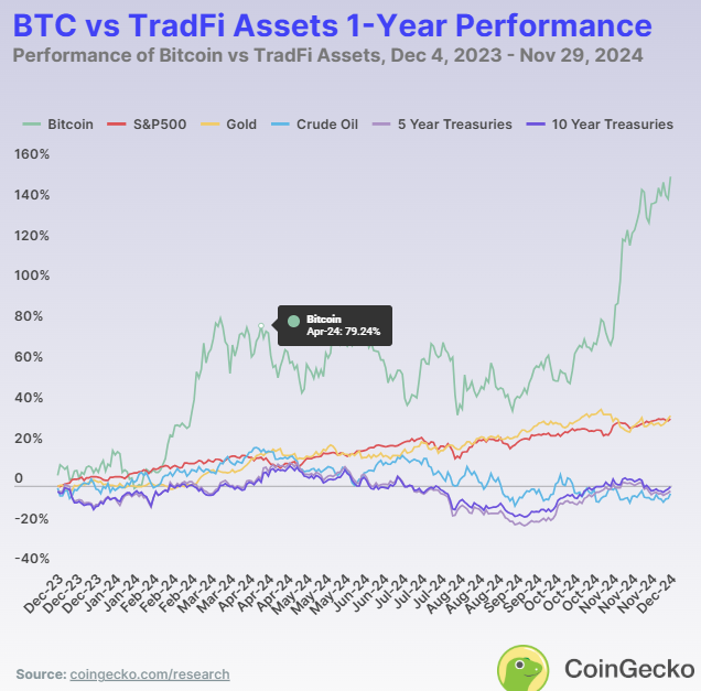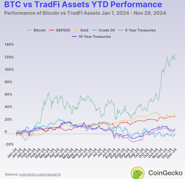 ประสิทธิภาพในปี 2026 แตกต่างจากปี 2024 อย่างสิ้นเชิง โดยนำข้อมูลเปรียบเทียบประสิทธิภาพของ Bitcoin กับสินทรัพย์ประเภทอื่นในปี 2024 มาอ้างอิง (เผยแพร่เมื่อเดือนธันวาคม 2024)