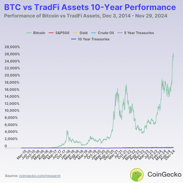 การสังเกตการณ์ในช่วง 10 ปีนี้แสดงให้เห็นว่า Bitcoin เป็นสินทรัพย์ที่มีการเติบโตสูงสุด ขณะที่ทองคำ พันธบัตร และหุ้นเป็นทางเลือกที่ปลอดภัยและมีผลตอบแทนที่ต่ำกว่าสำหรับนักลงทุนที่หลีกเลี่ยงความเสี่ยง อย่างไรก็ตาม Bitcoin ในตอนนั้นยังคงเป็นสินทรัพย์ที่ค่อนข้างใหม่ ซึ่งมีมูลค่าตลาดต่ำกว่าสินทรัพย์อื่นๆ อย่างมาก ด้วยฐานที่เล็กกว่าทำให้ Bitcoin สามารถเติบโตได้ด้วยอัตราที่เร็วกว่า