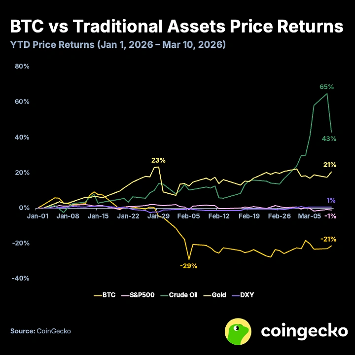 หลังจากผ่านช่วงปลายปี 2025 ที่ผันผวนมาได้แล้ว ราคา Bitcoin ยังคงปรับตัวลดลงอย่างต่อเนื่องในช่วงต้นปี 2026 ในขณะเดียวกัน เหตุการณ์ทางภูมิรัฐศาสตร์และเศรษฐศาสตร์มหภาคได้ผลักดันให้ราคาทองคำ เงิน และน้ำมันดิบเพิ่มสูงขึ้น เมื่อคริปโตเคอร์เรนซีในฐานะสินทรัพย์ประเภทหนึ่งยังคงได้รับการยอมรับในกระแสหลัก นักลงทุนหลายคนใน Wall Street อาจกำลังเผชิญกับตลาดหมีคริปโตครั้งแรกของพวกเขา Coingecko ได้ตรวจสอบประสิทธิภาพของคริปโตเคอร์เรนซีในช่วงต้นปี 2026 เมื่อเทียบกับสินทรัพย์ประเภทดั้งเดิมอื่น ๆ
